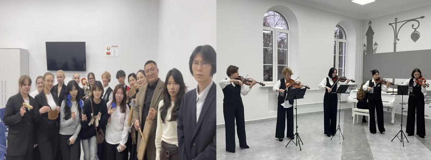 在座谈交流结束后,维捷布斯克国立大学相关学院负责人带领我校实践团开展校内教学与实训场所参观。美术与图形艺术学院院长索科洛娃介绍了美术教育专业的教学环境、创作工作室及文物修复实验室,重点展示了学院在艺术实践、材料技法与文化遗产修复领域的教学特色。数学与信息技术学院院长 扎列斯卡娅带领实践团参观学校的计算机与信息技术实验室,介绍数字化教学资源、信息技术课程体系及相关科研成果。化学生物与地理科学学院院长托尔卡切娃向我校师生展示跨学科综合实验室与生物科学实践教学条件,解读学院在实验技能培养、综合课程设计等方面的建设做法。在学前教育教学区域,实践团先后走进木偶剧实训室、儿童乐器教学室和手工活动室,白方教师系统介绍了该专业的核心课程体系、教学方法和实践组织方式。我校学生与白方学生共同参与木偶情景剧模拟、节奏启蒙练习及创意手工制作等活动,体验到白方重视儿童创造力与综合表现能力的教学理念。在音乐教育区域,实践团参观了合唱授课实训室、舞蹈排练厅及琴房等教学设施,我校学生现场参与声部分组练习、基础舞步训练及节奏模仿,与白方学生共同完成多项音乐实践任务,切身感受白方在音乐教育中对舞台表现力、团队协作和艺术综合能力的重视。其间,实践团与大学俄语教研室负责人及教师开展了语言学习专项交流,就我校学生在白俄罗斯学习俄语的整体情况、不同专业对俄语能力的要求、专业俄语课程设置等内容进行了深入座谈。双方围绕强化语言基础训练、优化专业俄语课程体系、加强学习过程跟踪、完善教学衔接机制等议题交换意见,就未来在俄语课程共建、教师互访授课以及线上线下混合式教学合作等方面达成初步共识,为合作办学项目中文化能力培养与语言学习质量保障提供了重要支撑。