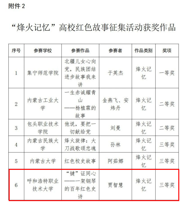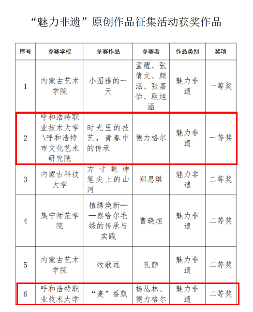 近日,自治区教育厅全区高校“礼敬中华优秀传统文化”宣传教育活动评选结果公布,我校三部作品脱颖而出、斩获佳绩——德力格尔《时光里的技艺,青春中的传承》获“魅力非遗”原创作品一等奖;杨丛林、德力格尔《“麦”香飘》获“魅力非遗”原创作品二等奖;贾智慧《“键”证同心——一架钢琴的百年红色史》获“烽火记忆”高校红色故事三等奖。