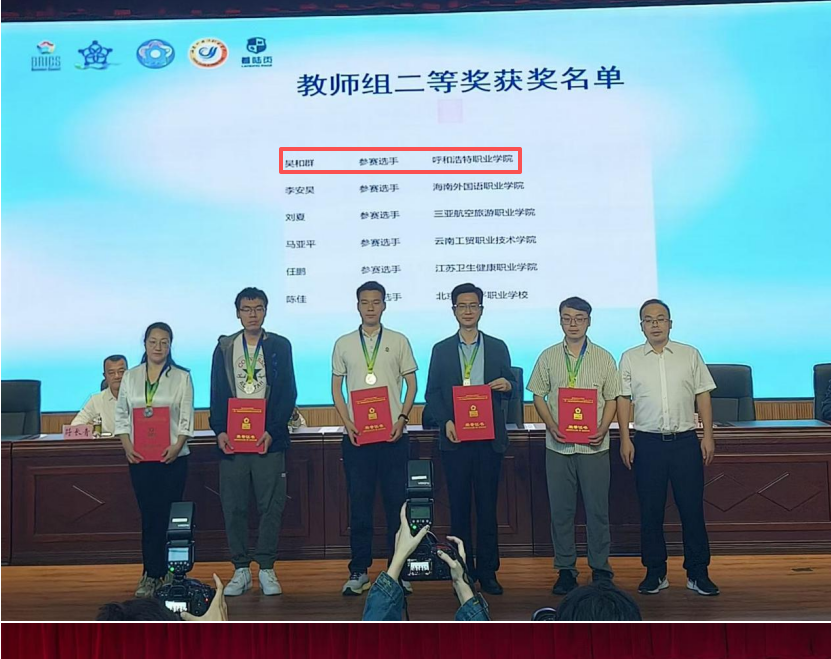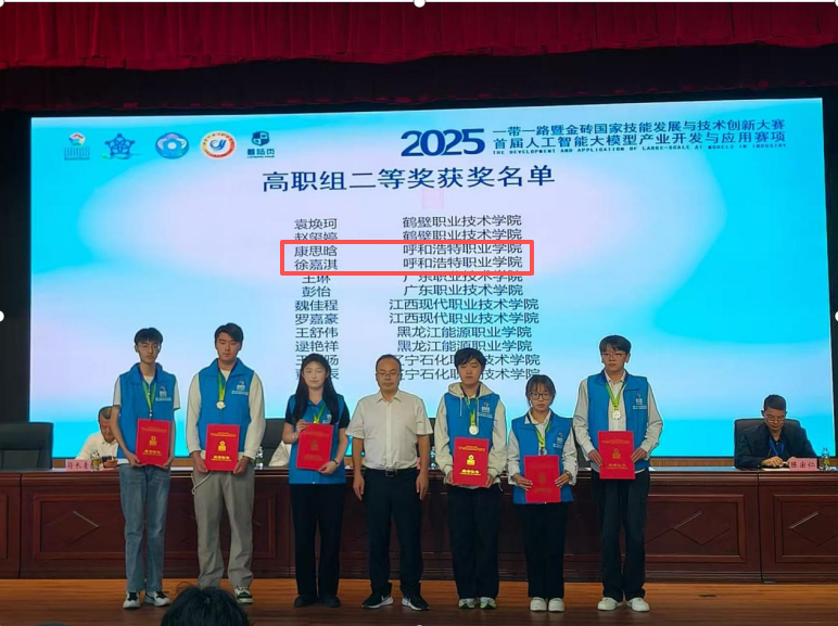 该赛项于12月6日至7日在海南省文昌市举行,涵盖大模型技术原理、产业场景应用开发、系统部署与优化等内容,全面考察选手的技术理解、工程实践与创新应用能力。由吴和群、李亚嘉两位老师悉心指导的24级大数据专业学生康思晗、徐嘉淇荣获高职组二等奖;吴和群在教师组个人赛中凭借扎实的专业素养与教学转化能力,荣获二等奖。此外,呼和浩特职业技术大学因参赛组织工作表现突出,荣获两项“优秀组织奖”。