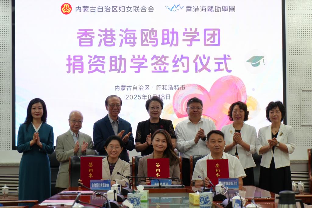 8月18日上午,香港海鸥助学团与呼和浩特职业技术大学、内蒙古农业大学、内蒙古艺术学院、内蒙古科技大学包头师范学院在内蒙古农业大学书仲会议室举行捐资助学签约仪式。自治区妇联党组书记、主席王芳,香港海鸥助学团代表卢沃棠、张霭妮,我校党委书记曹红、党委副书记白海林等领导出席。仪式由自治区妇联党组成员、副主席仲玉霞主持。