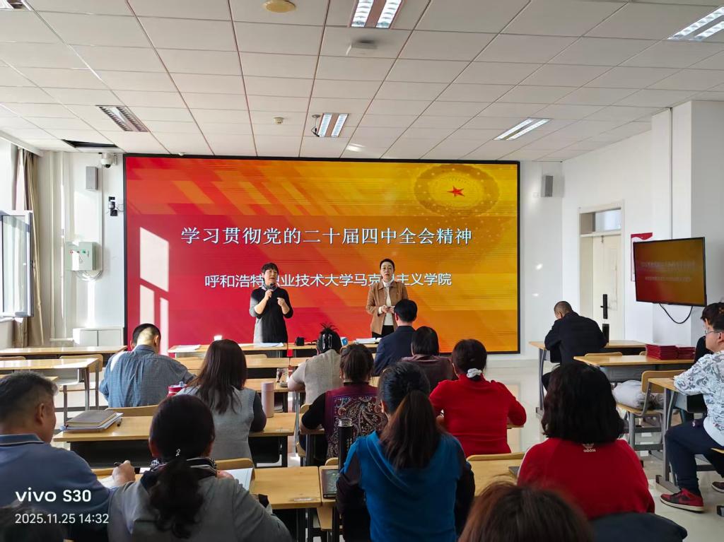 根据学校党委深入贯彻党的二十届四中全会精神学习教育的安排,11月25日下午,学校在励学楼329教室召开党的二十届四中全会精神宣讲暨融入思政课集体备课会,学校党委委员、宣传统战部部长刘惠华、马克思主义学院班子成员、党的二十届四中全会精神宣讲团成员及全体思政课教师参加,集体备课会由马克思主义学院党支部书记、负责人李艳芬教授主持。