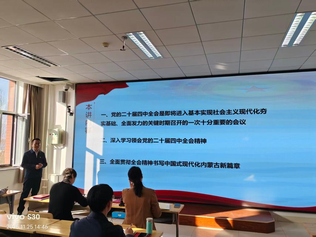 其次,由宣讲团成员、集体备课的主备人、马克思主义学院教师骆仲楠从党的二十届四中全会是进入基本实现现代化夯实基础,全面发力的关键时期召开的一次十分重要会议;深入学习领会党的二十届四中全会精神;全面贯彻全会精神书写中国式现代化内蒙古新篇章三个方面作了示范宣讲,骆老师用一个个生动鲜活的事例、一组组客观翔实的数据,严谨的表述、科学的逻辑为宣讲团成员做出了示范。