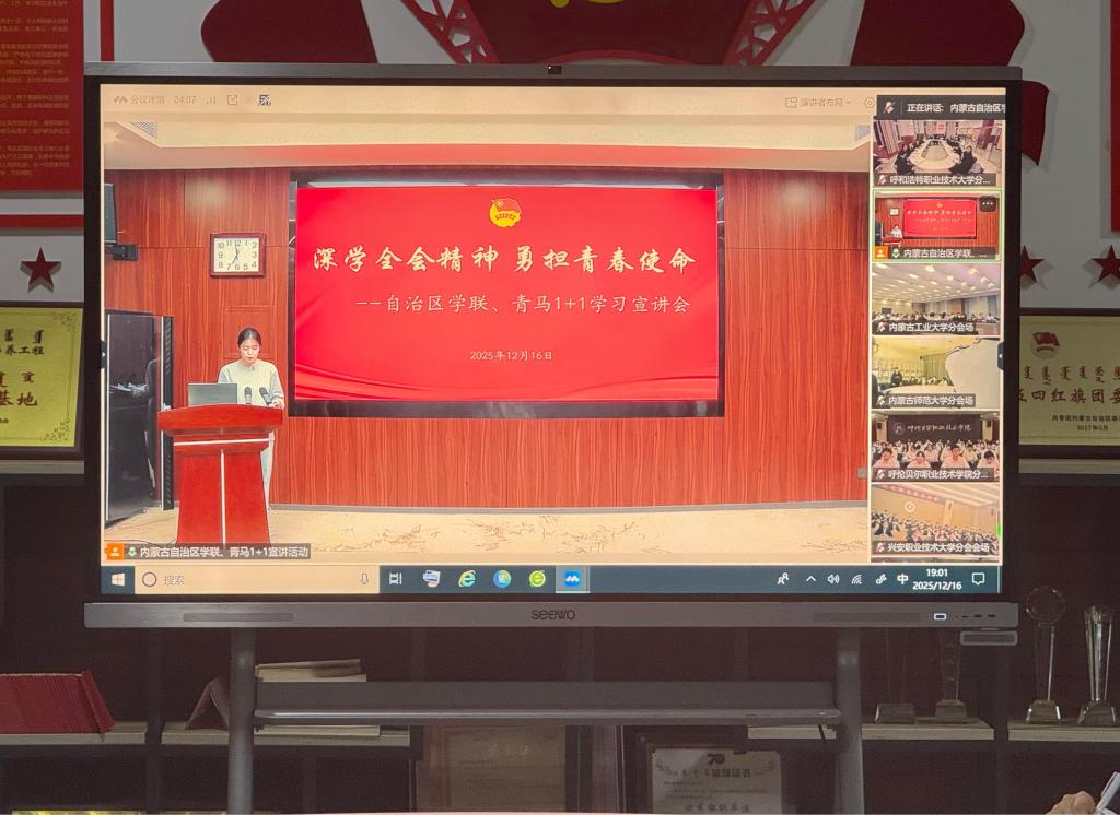 12月16日晚,内蒙古自治区学联、“青马工程”高校班“1+1”学习宣讲活动以线上线下相结合的形式举办。我校团委在励学楼“团青之家”设立分会场,校学生会主席团成员、各部门负责人及第十四期“青马班”学员代表参加活动。