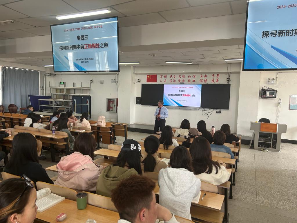 学院党委高度重视思政课教学,带头推动思政课建设,4月16日,在品学楼401教室,学院党委委员、副院长嘎日迪走进课堂,以“探寻新时期中美正确相处之道”为主题,为经济管理与法学系23级法律事务1班、大数据与会计2班的同学们带来了一堂深刻且极具教育意义的思政课。