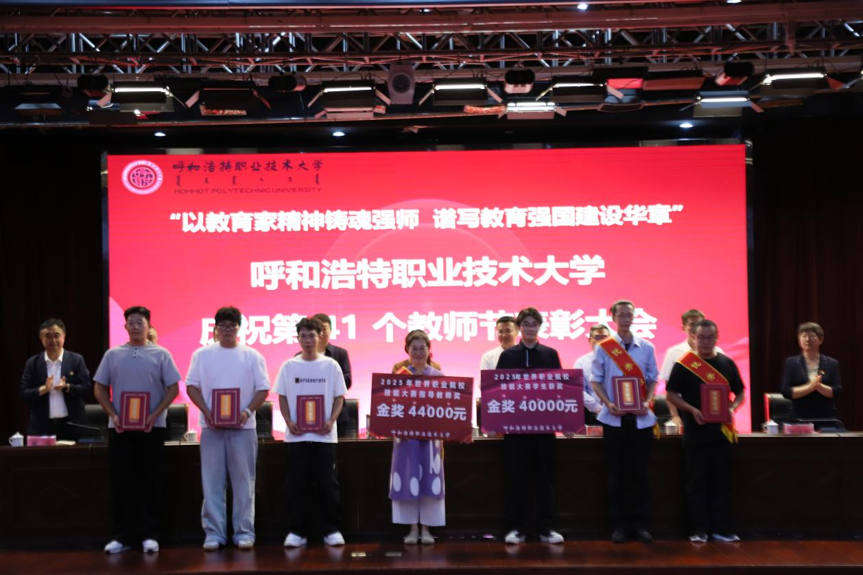 “以教育家精神铸魂强师,谱写教育强国建设华章”,今年是我国第41个教师节,也是呼和浩特职业技术大学成立后的第一个教师节。为庆祝教师节并同步表彰在师生技能大赛中涌现出的先进集体与个人,9月9日下午,我校在图书馆二楼报告厅举行第41个教师节暨师生技能大赛表彰大会。党委副书记、校长杨乌日吐主持大会。