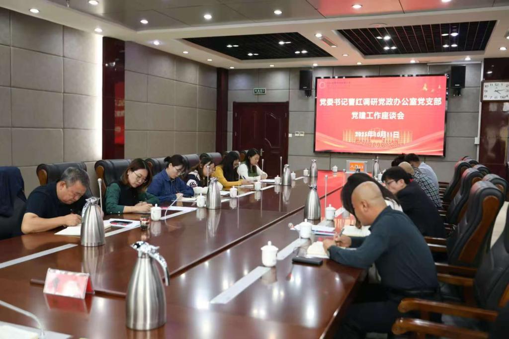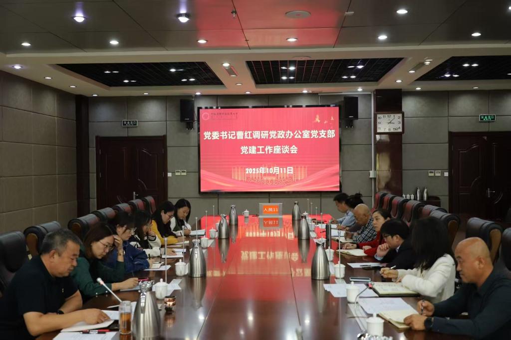 为深入贯彻落实习近平总书记关于党建工作的重要论述,全面落实新时代党的建设总要求,将新发展理念落到实处、变成普遍实践,2025年10月11日,学校党委书记曹红莅临党政办公室,围绕铸牢中华民族共同体意识工作主线,就党支部建设、党建工作与业务融合等情况开展调研。党政办公室党支部全体党员参加此次调研座谈会,党支部书记杜煊主持会议。