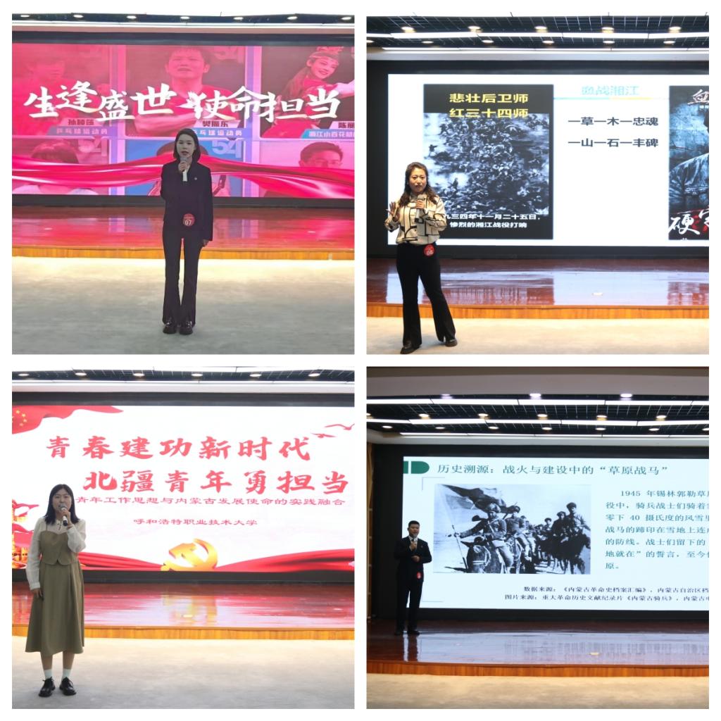 决赛现场,9名教师、12名学生团干部同台竞技。选手围绕“传红色基因 讲时代理论”的主题,选手紧扣“四史”铸牢中华民族共同体意识、习近平总书记关于青年工作的重要思想、青年使命担当等核心,结合工作实际设计团课,用案例分析、故事讲解、互动问答、多媒体展示等形式,呈现《青春“练肌”指南》《生逢盛世的使命担当》《蒙古马精神在草原红色征程中的传承与新时代价值》《彝海结盟铸同心—长征路上的民族团结》等精品团课,展现新时代团干部的政治觉悟和育人智慧。