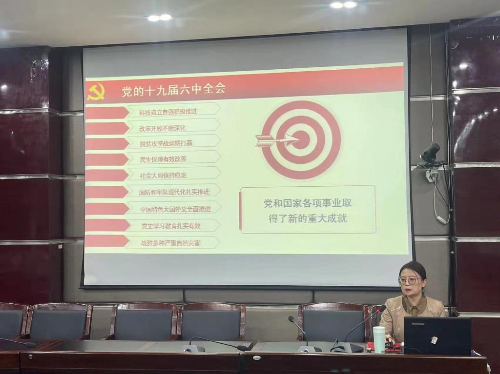 会上,杨永利老师以《百年奋斗再启新程——学习贯彻党的十九届六中全会精神》为题进行了宣讲,她从十九届六中全会的基本情况、全会的主要成果、《决议》的核心要义和学习贯彻全会精神四方面进行了提炼归纳,全面详细地概括了党的十九届六中全会主要精神。杨老师特别指出,党中央号召大家,要更加紧密地团结在以习近平同志为核心的党中央周围,以习近平新时代中国特色社会主义思想为指导,大力弘扬伟大建党精神,勿忘昨天的苦难辉煌,无愧今天的使命担当,不负明天的伟大梦想,以史为鉴、开创未来,埋头苦干、勇毅前行,为实现第二个百年奋斗目标、实现中华民族伟大复兴的中国梦而不懈奋斗。
