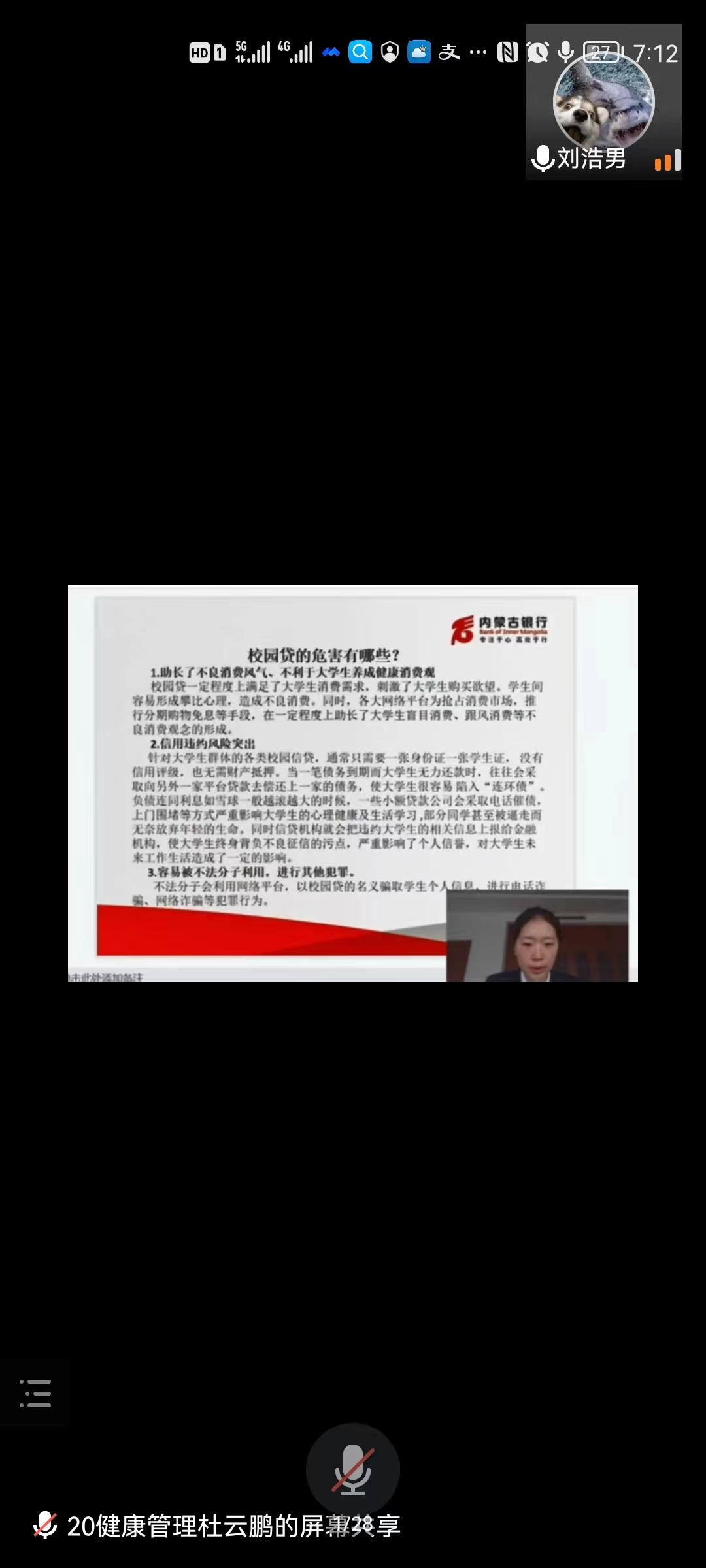 为进一步提高学生防范金融诈骗的意识,减少金融诈骗案件的发生。2022年6月16日医药卫生系线上开展“校园贷、个人征信及网络诈骗专题”讲座。此次活动有幸请到内蒙古银行锡林郭勒额吉淖尔支行张婧主任为我系学生进行专业讲解。
