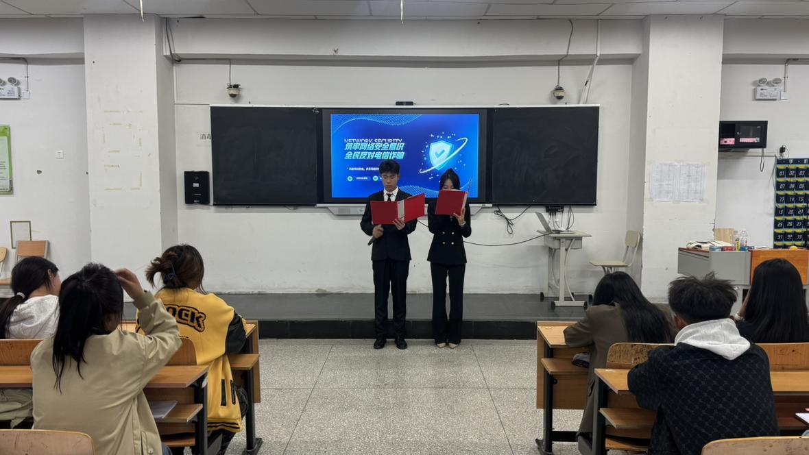 活动现场氛围浓厚,内容设计兼具知识性与感染力。开篇,2025级刘金禹同学以国家网络安全宣传周为切入点,系统讲解活动设立背景与时代意义,用鲜活数据点明当前网络安全形势的紧迫性,引导同学们正视“数字时代安全防护”的重要性;随后,王浩成同学聚焦“网络陷阱识别”核心需求,结合校园贷、虚假购物、仿冒亲友求助等学生群体高发案例,通过“案例拆解+实操演示”的方式,细致讲解防范技巧与应急处置方法,让抽象的安全知识转化为可落地的防护能力。演讲环节更是将活动推向高潮。李嘉磊同学以《共筑网络安全防线 远离诈骗陷阱》为题,从“个人-校园-社会”三个维度发出倡议,号召大家主动成为网络安全的“宣传员”;侯利同学则在《筑牢数字防线 共筑反诈长城》演讲中,结合身边真实案例强调“每个人都是网络安全第一责任人”,真挚的表达引发全场强烈共鸣。