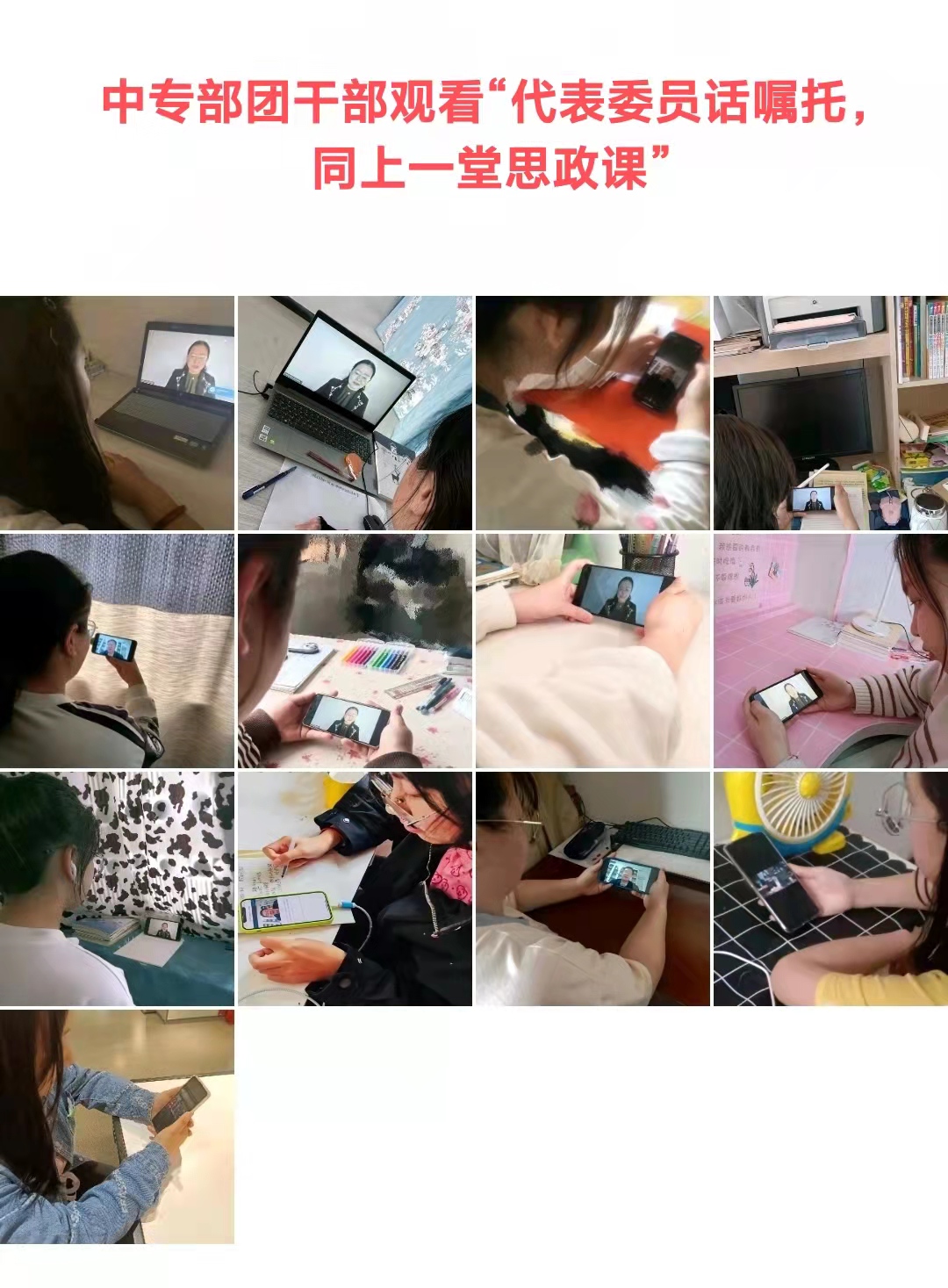 3月13日下午,应学院团委要求,中专部团总支组织各班团干部观看“代表委员话嘱托,同上一堂思政课”会议直播。