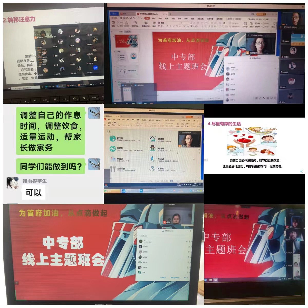 2022年3月11日晚上,中专部召开了每周一次的班会,疫情期间,尽管我们居家办工,但是各年级班主任还是将班会活动进行的形式多样,内容丰富。本次班会的主题是“为首府加油,从点滴做起”。