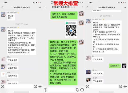 特殊的疫情变化,使班主任的排查工作持续进行,只要学生工作处下发通知,班主任一定在第一时间对班级学生进行通知、统计、核对、上报。保证了在规定时间内准确无误的反馈学生情况。