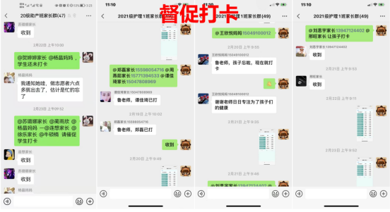 疫情就是命令、防控就是责任。班主任认真落实“学生每日健康打卡制度”,精准掌握本班学生健康状况。对没有及时打卡的学生,班主任不厌其烦的一遍遍的联系家长,督促学生。保证了每天在规定时间内学生全部完成打卡。