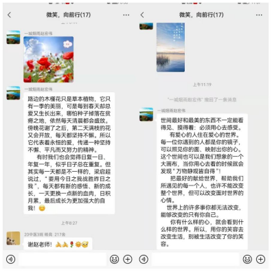 镜头五:清晨的第一声问候来自心理老师的鼓励。