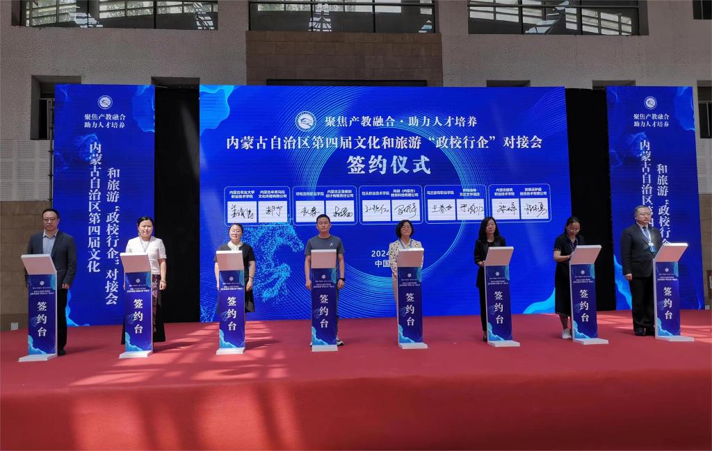 为深入学习贯彻习近平总书记重要指示和关于旅游发展的重要论述,构建校企合作产教融合的高质量发展新生态,赋能文旅新质生产力,2024年6月23日由内蒙古自治区文化和旅游厅、内蒙古自治区教育厅、内蒙古自治区人力资源和社会保障厅主办,内蒙古农业大学职业技术学院承办,内蒙古旅游职业教育专业建设指导委员会、内蒙古自治区旅游协会旅游教育分会、呼和浩特职业学院协办的“聚焦产教融合 助力人才培养”——自治区第四届文化和旅游政校行企对接会成功举办。来自全区文旅行业的12个盟市文旅局、33家旅游院校、86家文旅企业、5个行业协会、14家新闻媒体,共300余人参会。