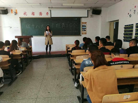 为深入贯彻习近平新时代中国特色社会主义思想和党的十九大精神,把握共青团的政治性、先进性和群众性要求,做好团十八大代表的选举推荐工作。4月11日、12日,人文与旅游学院严格按照选举工作流程,召开专题工作部署及培训会,指导各班级团支部开展代表选举工作。各班级团支部通过自下而上、上下结合的办法,共推报17名代表候选人至团总支。团总支根据选举工作流程,于4月11日下午,组织召开团总支工作会议,人文与旅游学院团学干部、各班级团支部书记及各优秀团员代表等参加了此次会议。