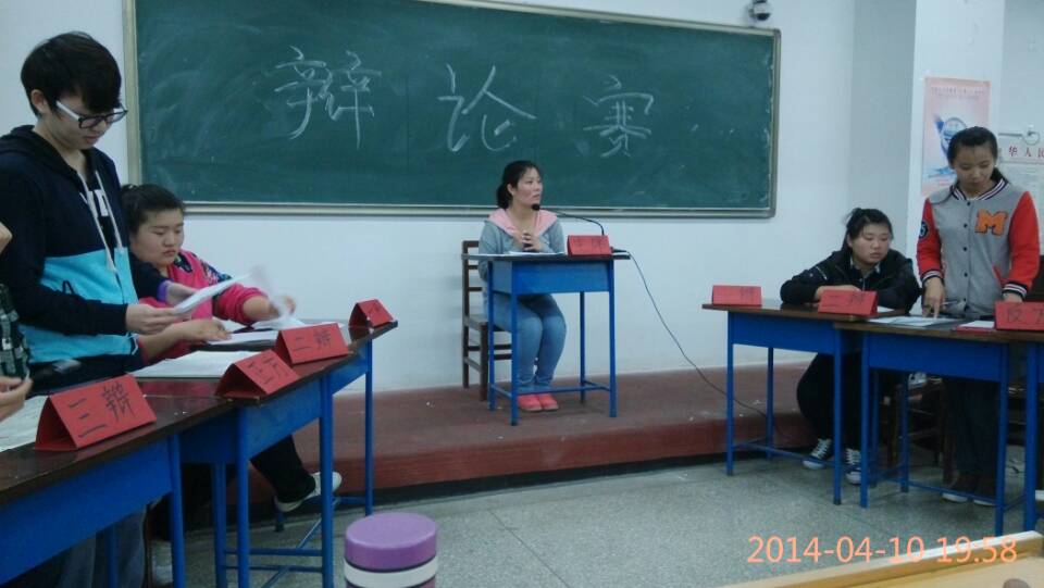 2014年4月10日晚上7点30分,由人文与旅游学院院学生会主办及承办的第一届辩论赛如期举行。比赛由学院语文教育专业对战旅游酒店专业,本次比赛特邀学生会主席,部长,团总支副书记担任评委。最终语文教育专业以充分的准备赢得了比赛。