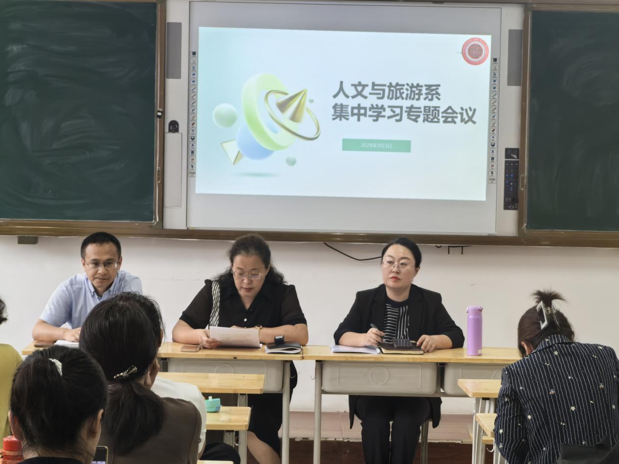 为了推进课程思政示范项目建设实施以及加强学籍管理的规范性,按照学院相关工作安排,人文与旅游系于9月3日14:30在407教室组织了集中学习会议。领导班子成员和全体教职工参会。