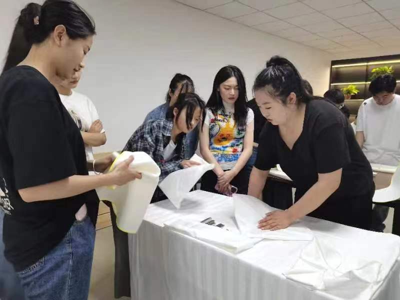 活动通过比赛的形式进行,把同学们分别分为中餐宴会组、西餐宴会组、中式铺床等组别,同一组别两两对抗。比赛内容对标宴会服务人员及客房服务人员具体岗位标准的工作任务进行设计,并对标职业院校技能大赛标准。同学们在铺设台布、摆放餐具、餐巾折花、主题设计、铺床、对客服务中体验岗位、了解职业、感受职业教育、锻炼职业技能。