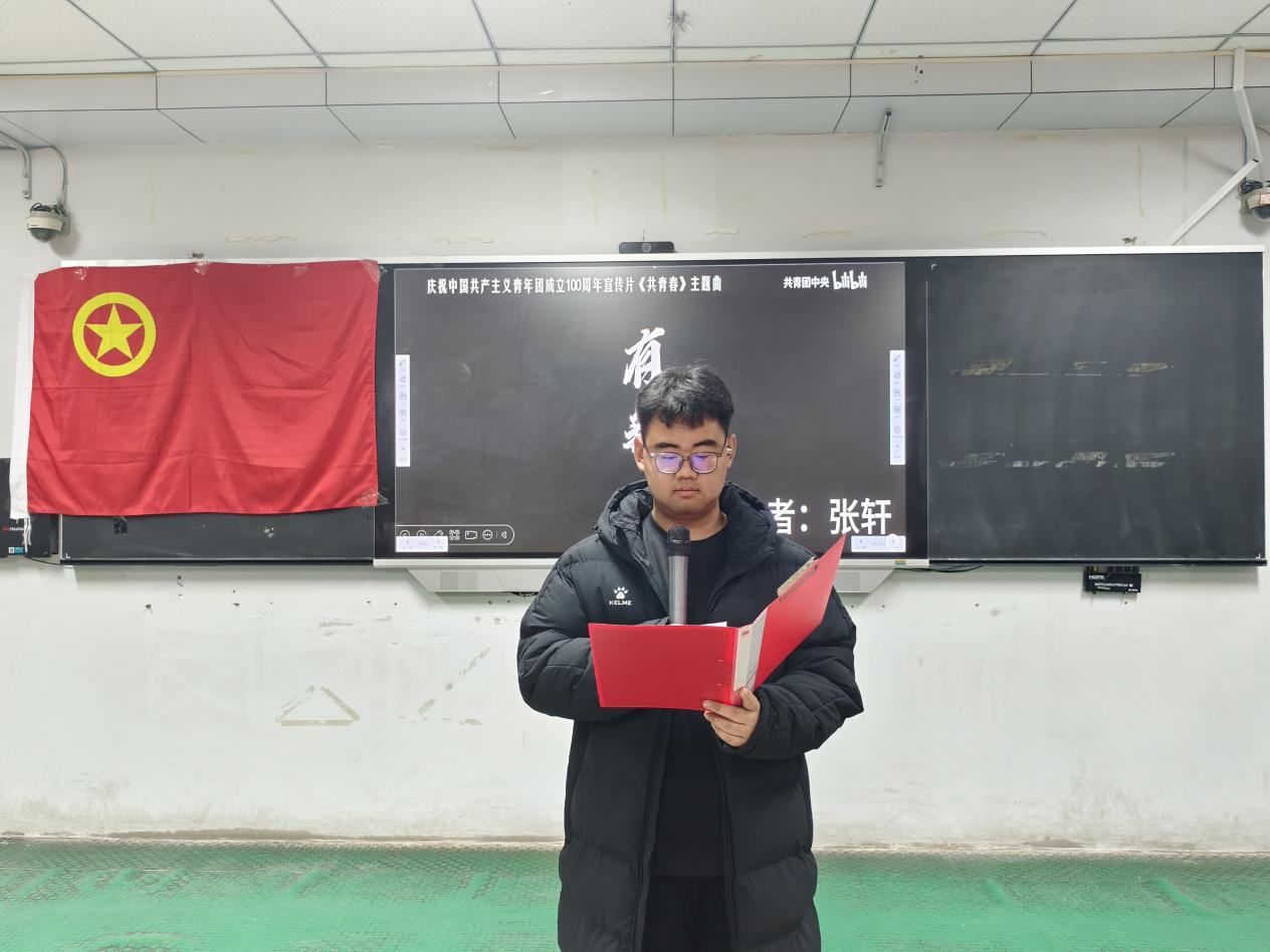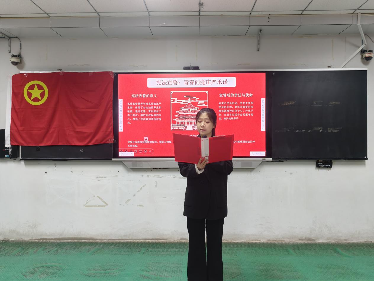 本次团日活动在激昂的《光荣啊,中国共青团》歌声中拉开帷幕。活动伊始,主持人向同学们阐释了宪法的核心地位与重要作用,明确了学习与遵守宪法的重要意义。在庄严的宪法宣誓环节,全体同学高举右拳、齐声宣誓,郑重承诺以实际行动践行宪法精神,将法治理念融入思想与行动。才艺表演环节中,赵书曼、韩宇洁同学朗诵了《维护宪法权威,宣传宪法知识》,以真挚的情感诠释了宪法与国家发展的紧密联系。张笑宁同学带来的朗诵《弘扬宪法精神》,传递出青年以法治护航成长的坚定信念。张轩同学演唱了《有我》,用饱满的歌声诠释青春担当,将对家国的赤诚与奋进的信念融入激昂的旋律之中。