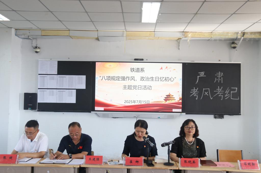 为深入学习贯彻党的二十大精神,进一步加强党员干部作风建设,强化党性修养,铁道系党总支于7月15日组织开展了“八项规定强作风,政治生日忆初心”主题党日活动。活动通过理论学习、警示教育、入党经验交流、政治生日卡片、重温入党誓词等环节,引导全体党员筑牢思想防线,永葆政治本色。