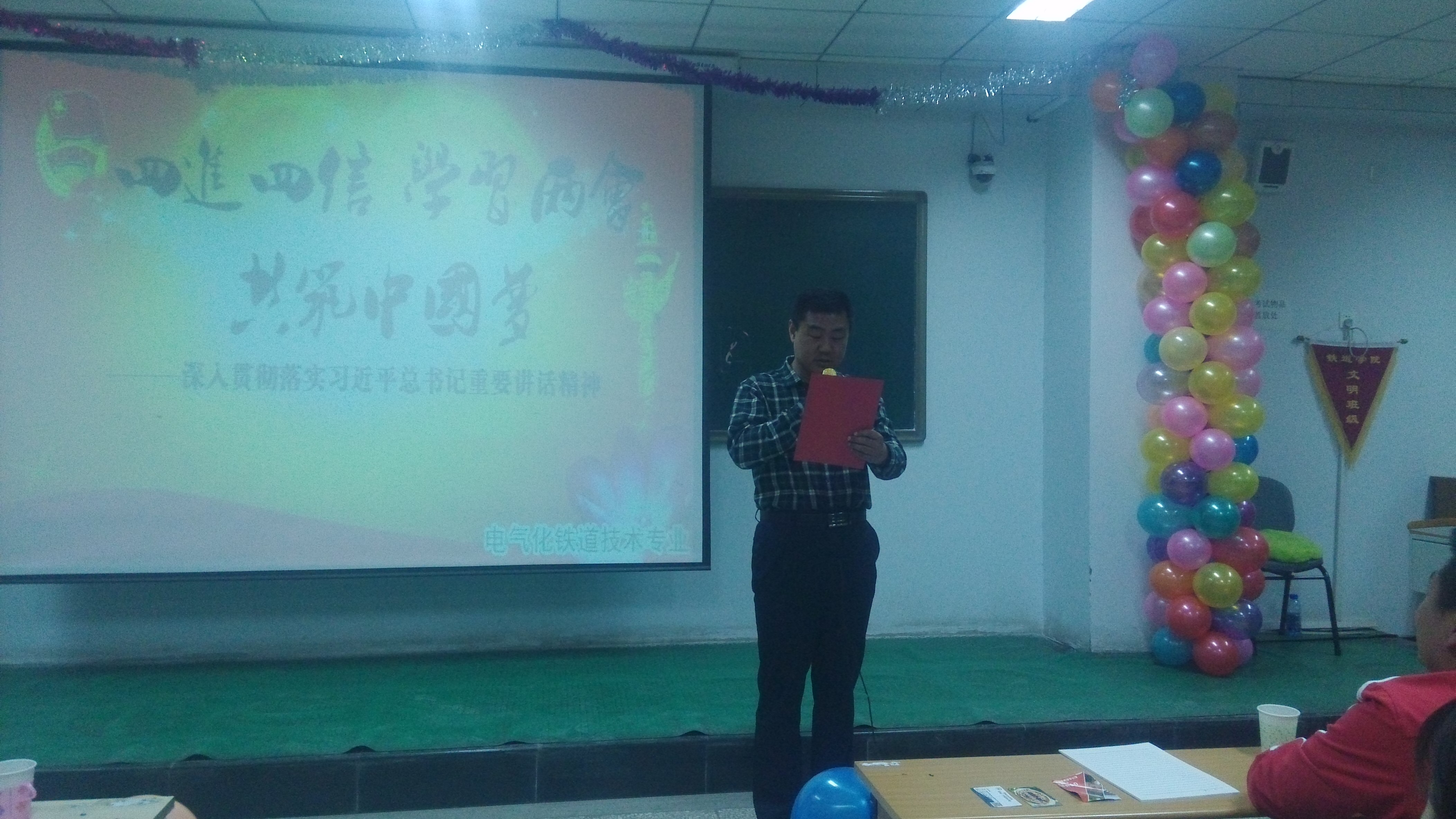 2015年5月7日晚7点30分铁道学院在北教学楼209教室举办了“四进四信”系列活动。2014级电气化铁道技术一班和二班全体学生参加了此次活动,出席本次活动的嘉宾有铁道学院副院长王晓东、学生科科长王振康、团总支书记王晓磊、全体辅导员以及全体团总支学生会干部。