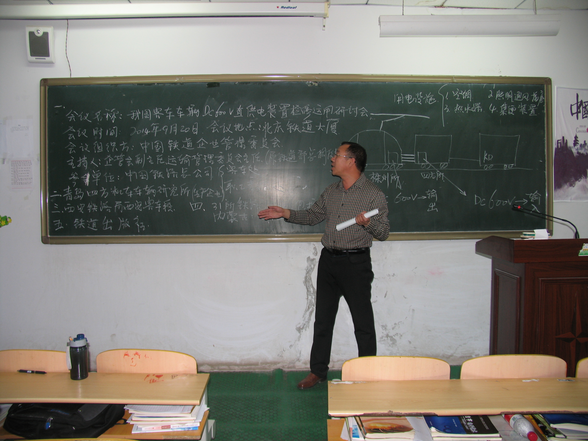 机车车辆教研室主任王宏亮老师对参加的“客车车辆DC600V直供电装置检修运用研讨会”情况做了介绍,提出怎样在取消发电车的情况下保证供电装置的可靠性,并且怎样实现校企之间的一个沟通。