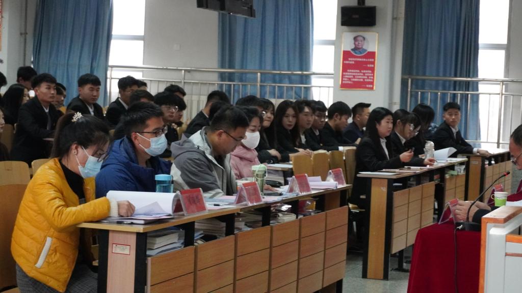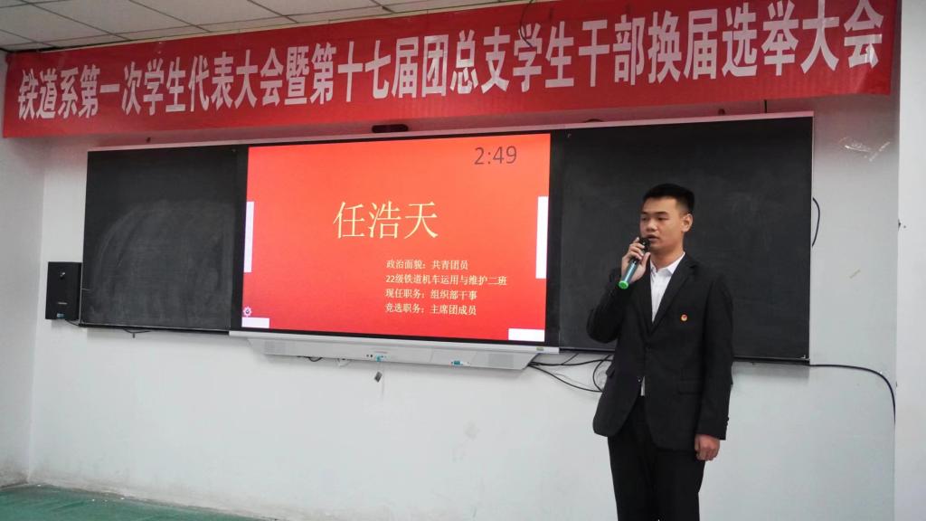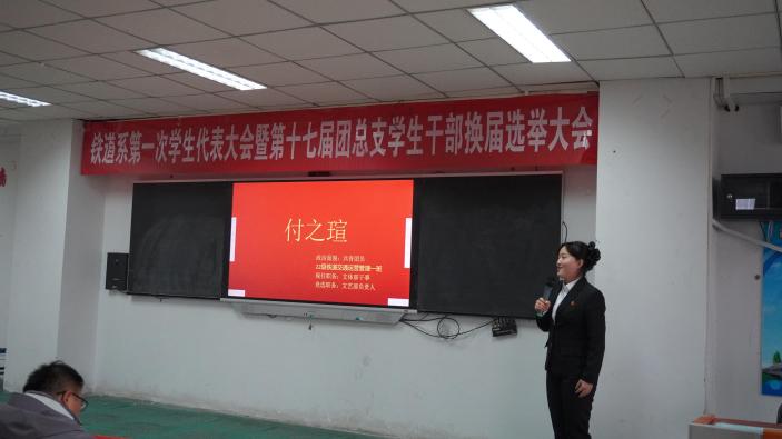伴随着激昂的《光荣啊,中国共青团》旋律,参会人员全体起立齐唱共青团团歌,会议正式开始。学生代表宣读《关于呼和浩特职业学院铁道系第一次学生代表大会的批复》和《关于召开共青团呼和浩特职业学院铁道系团总支第十七届团总支学生干部换届的批复》。铁道系党总支书记崔娜发表讲话,并对第十六届团总支学生会的工作给予肯定,对第十七届团总支学生会作出殷切希望,表示作为学生干部要始终提高政治站位,有大局观和责任感,认真对待团学工作,为同学做表率、工作中讲奉献、工作时严纪律、转作风;要树立并维护团学干部自身形象,争做正直、自律、拥有良好学风学貌的干部。铁道系第十六届团总支学生会团总支副书记和主席团成员进行工作报告。各位竞选人逐个进行演讲,展示自己并表明自己想要竞选的职位,从自身特点,对部门认知,亦或是对于团总支学生会未来工作的设想,展现一幅美丽的蓝图。他们的表现充分展示了自己良好的思想素质和工作能力,也赢得了老师以及团学干部的肯定。