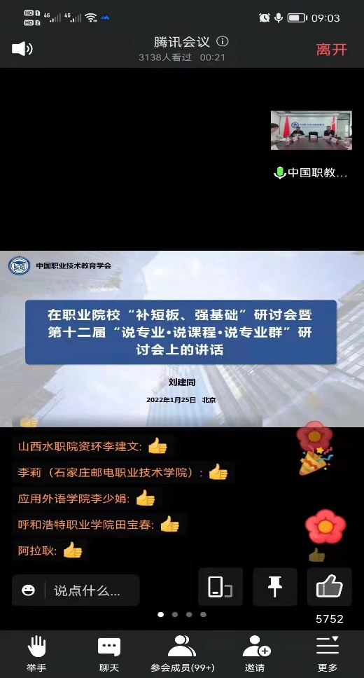 1月25日,中国职业技术教育学会第十二届“说专业·说课程·说专业群”研讨会在线上召开。本次研讨会以“固根基、补短板、赋能知识技术技能人才培养”为主题,旨在深入学习习近平总书记对职业教育工作的重要指示,落实2022年全国教育工作会议精神,切实推动《职业教育专业目录(2021年)》落地,推进职业教育专业升级和数字化改造,深化“三教”改革,提升职业教育现代化水平和服务能力。