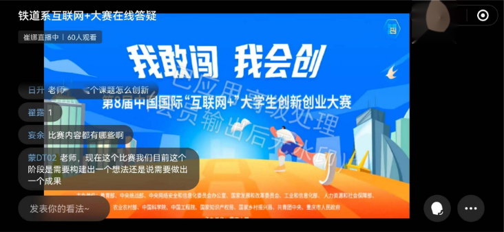 本次线上答疑会,旨在帮助大家解决师生在“互联网+”大赛项目申报过程中遇到的困难,激发了师生们的参赛热情,为铁道系组织好本次“互联网+”大赛奠定良好基础。
