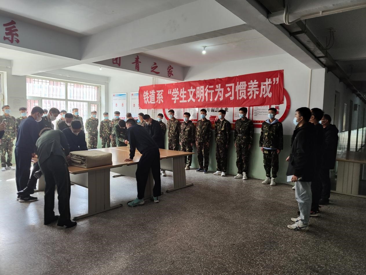 根据国家安排新生军训的政策,学习军人内务条令,铁道系积极响应国家政策,开展相关活动。希望同学可以体验到部队的纪律分明,军人的英姿煞爽。学军人之风范,强自身之素质。内务整理使新生们从依赖变得独立,陌生变得熟悉的重要一步,也很好地体现出新生对于军训的态度,“没有规矩不成方圆”,相信各位新生都可以将内务整理出色完成,做一个严于律己的新青年。希望他们能够持之以恒,从维护宿舍的良好环境开始,度过充实有意义的大学生活。