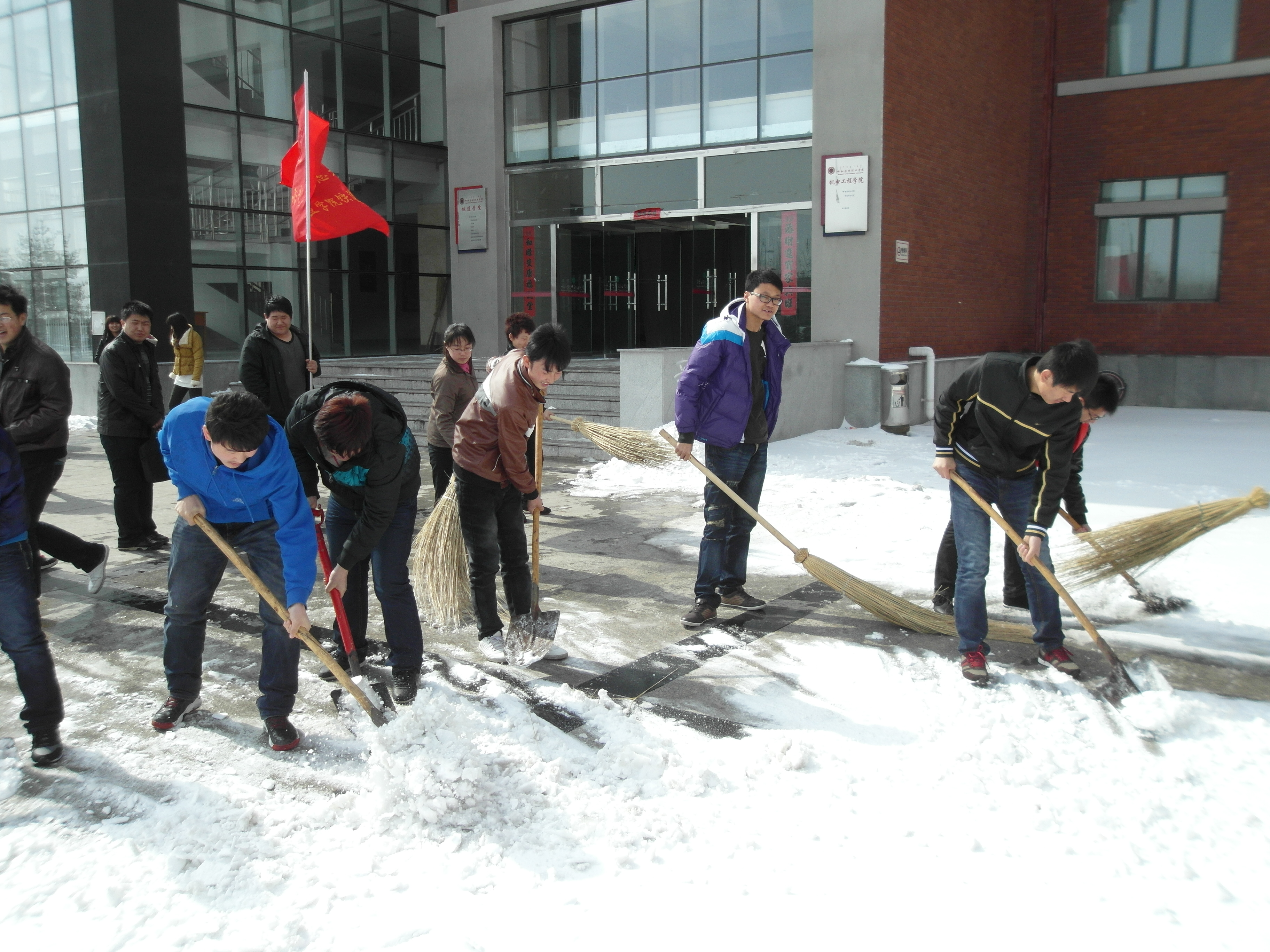 从2012年3月2日傍晚开始,呼和浩特地区普降大雪,至3月5日清晨,厚厚的白雪覆盖了学校校园。伴随着凛冽的寒风,气温骤降,积雪深度已达3厘米以上,给在校师生带来诸多不便,扫雪任务异常艰巨。对此,铁道学院青年志愿者大队于中午11点30分自发组织起扫雪队伍,清扫由北教学楼至图书馆的道路。