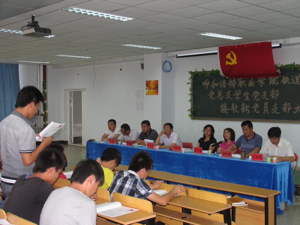 六月九日下午4:00,铁道学院在东校区北教学楼201教室召开了“铁道学院党总支学生党支部接收预备党员支部大会”,铁道学院院长冀文军、党总支书记张晓英、铁道学院副院长王晓东、铁道学院副院长李江南、办公室主任石明勋出、团总支书记王建强、学生科科长王振康席了会议,铁道学院学生党员及入党积极分子参加了会议。会议由王振康老师主持。