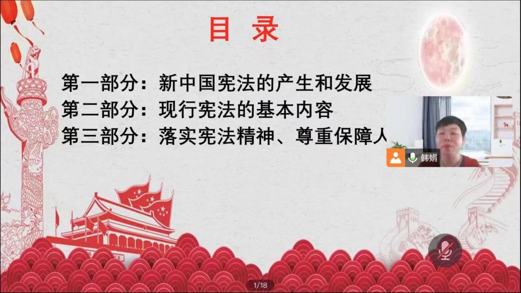 本次讲座的主讲人是经济管理与法学系,法律事务教研室专业带头人、副教授韩娟老师。她从新中国宪法的产生和发展,现行宪法的基本内容和落实宪法精神、尊重保障人权的宪法事件三个部分阐释了宪法的相关理论与丰富实践。讲座内容丰富,紧密结合实际,讲解生动有力。