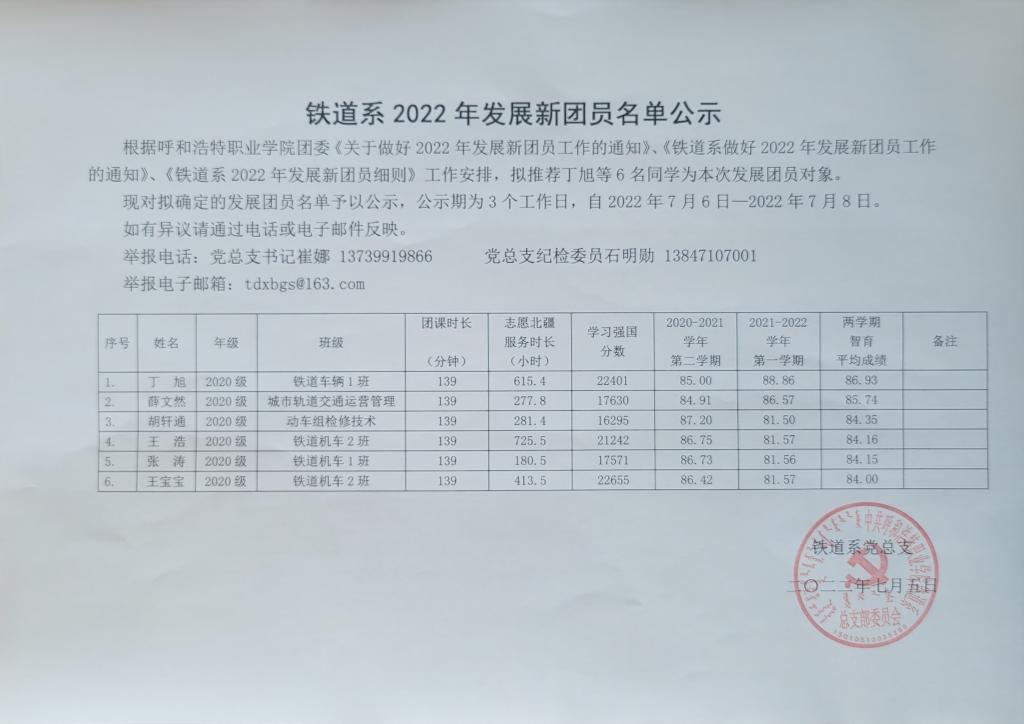 现将铁道系2022年发展团员名单进行公示,公示期为2022年7月6日至7月8日。