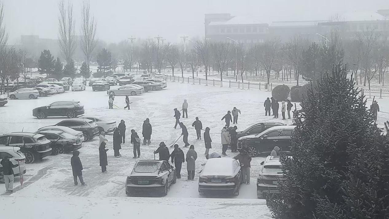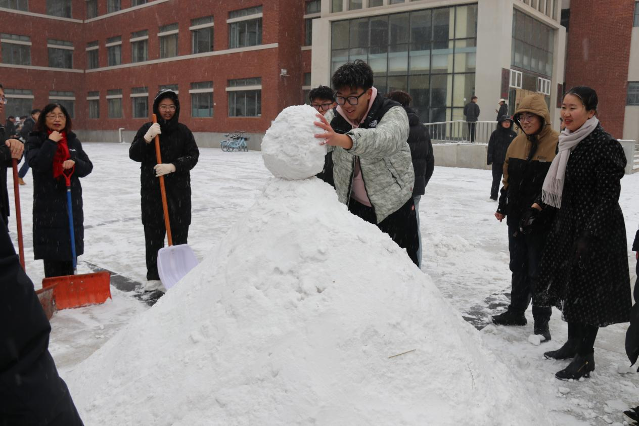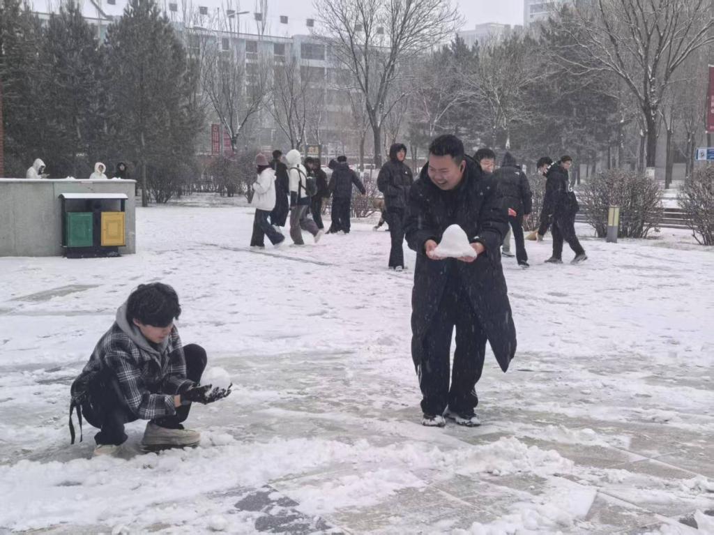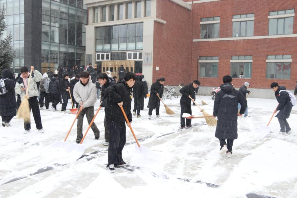 上午大课间,铁道学院师生自备工具,合力堆起面向教学楼的雪人,并开展打雪仗游戏。欢乐之余,服务校园的行动同步推进:由青年志愿者服务队统筹,全天轮流对静学楼西侧停车场、静学楼及励学楼周边路面、图书馆广场等区域扫雪,同学们分工协作,为校园出行扫清隐患。