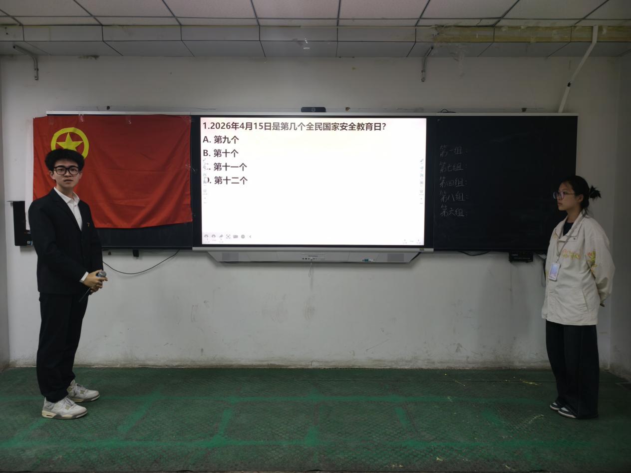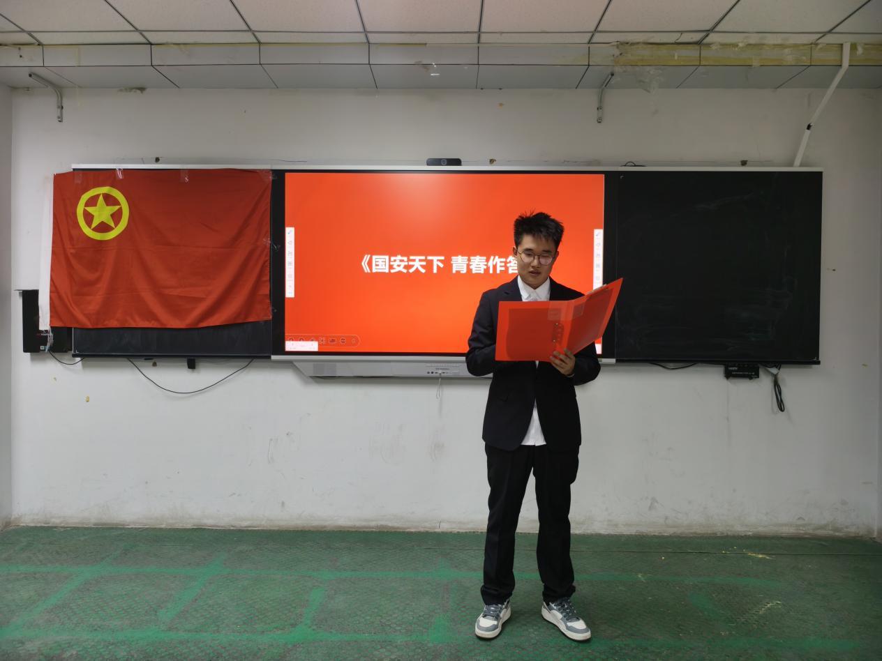 活动在《光荣啊,中国共青团》歌声中拉开帷幕。活动伊始,主持人围绕总体国家安全观核心要义,系统讲解“五大要素”,并结合“十五五”规划相关内容,深入阐释国家安全与国家发展、青年使命担当之间的内在联系。随后开展“青年说安全”微宣讲,同学们结合专业学习与校园生活,分享网络安全风险隐患及防范措施。全体同学共同观看国家安全教育及反间谍警示教育片,进一步强化团员身份意识与责任担当。才艺表演环节,李曙雨、赵书曼、田雨三位同学依次朗诵主题诗篇,以铿锵昂扬的青春誓言传递家国情怀,诠释新时代青年与国家安全紧密相连的使命担当。国家安全知识竞赛环节中,同学们踊跃抢答、沉着应答,现场气氛活跃。竞赛紧扣国家安全重点知识与现实典型案例,使同学们在互动比拼中深化对相关知识的理解与记忆,进一步增强国家安全意识和风险防范能力。