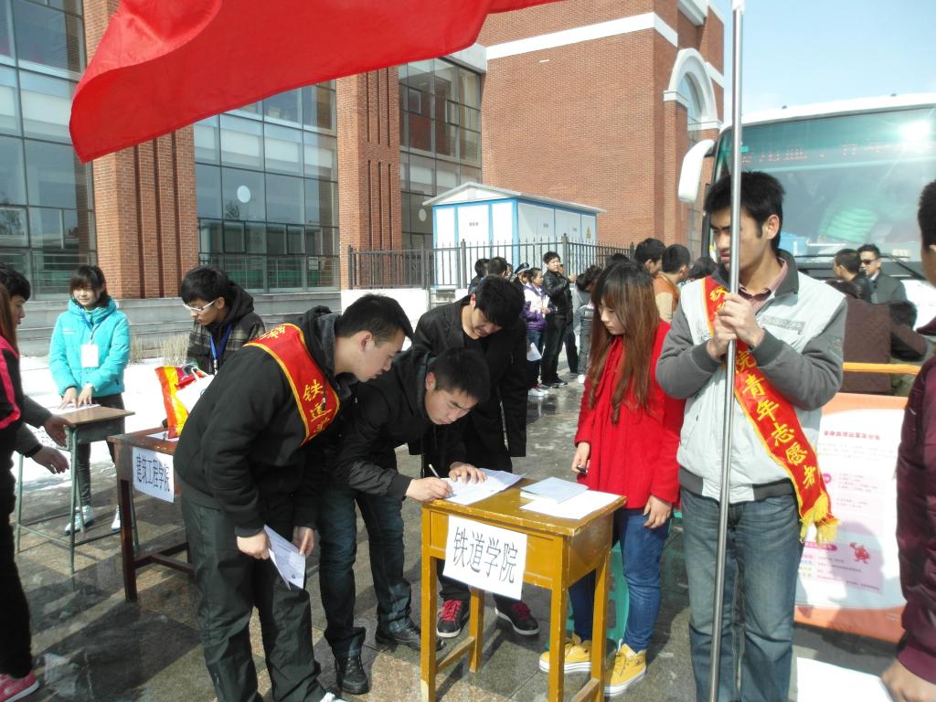 在献血报名处,“铁道学院青年志愿者”的大旗随风飘扬,现场人头攒动,挤满了前来献血的同学。咨询、填表、测血压、化验、抽血,一个个步骤井然有序地进行着。同学们以“学习雷锋、无私奉献”的精神相互鼓励,排队上车献血。