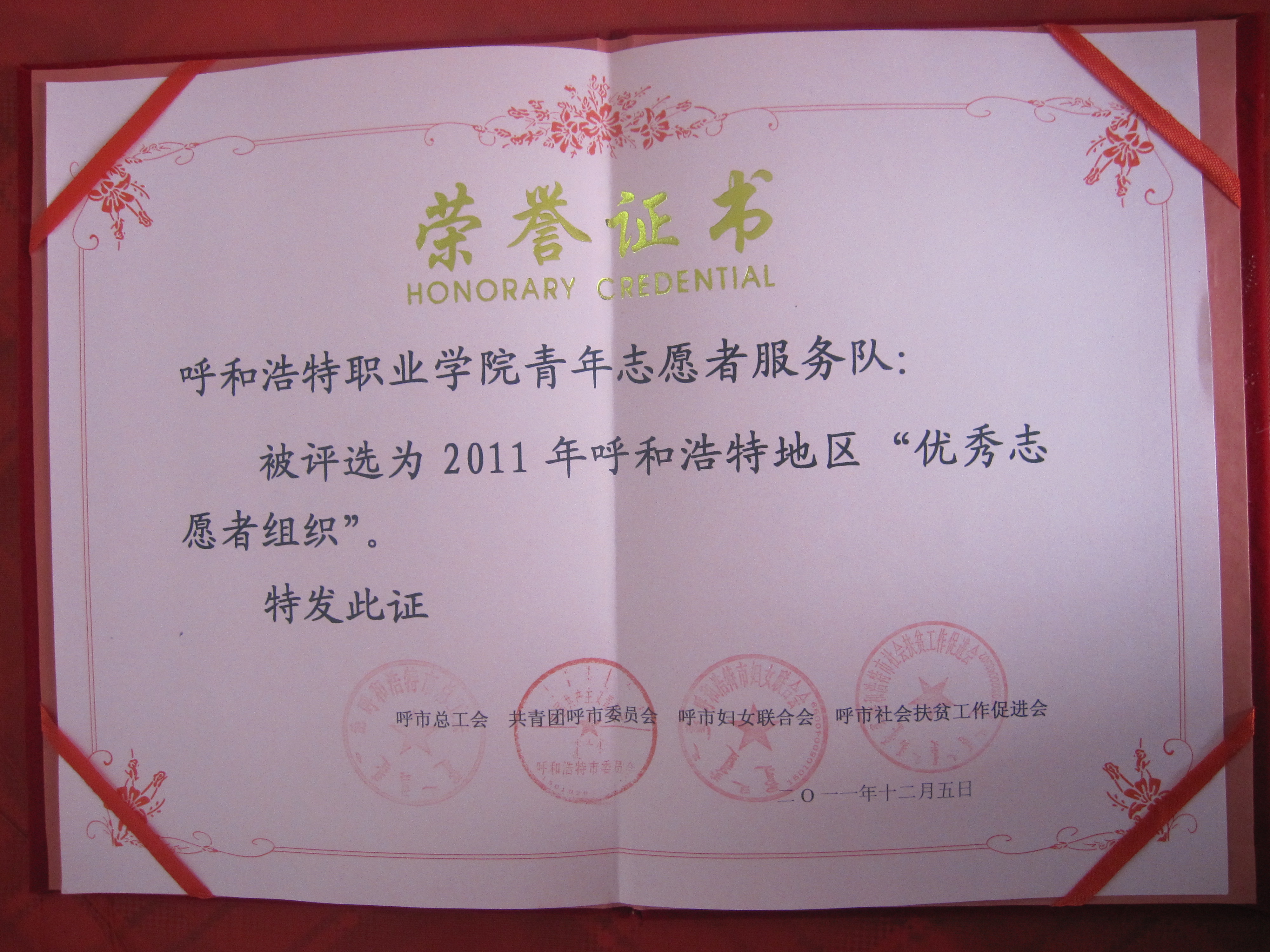 呼职院荣获2011年呼和浩特地区“优秀志愿者组织”荣誉称号