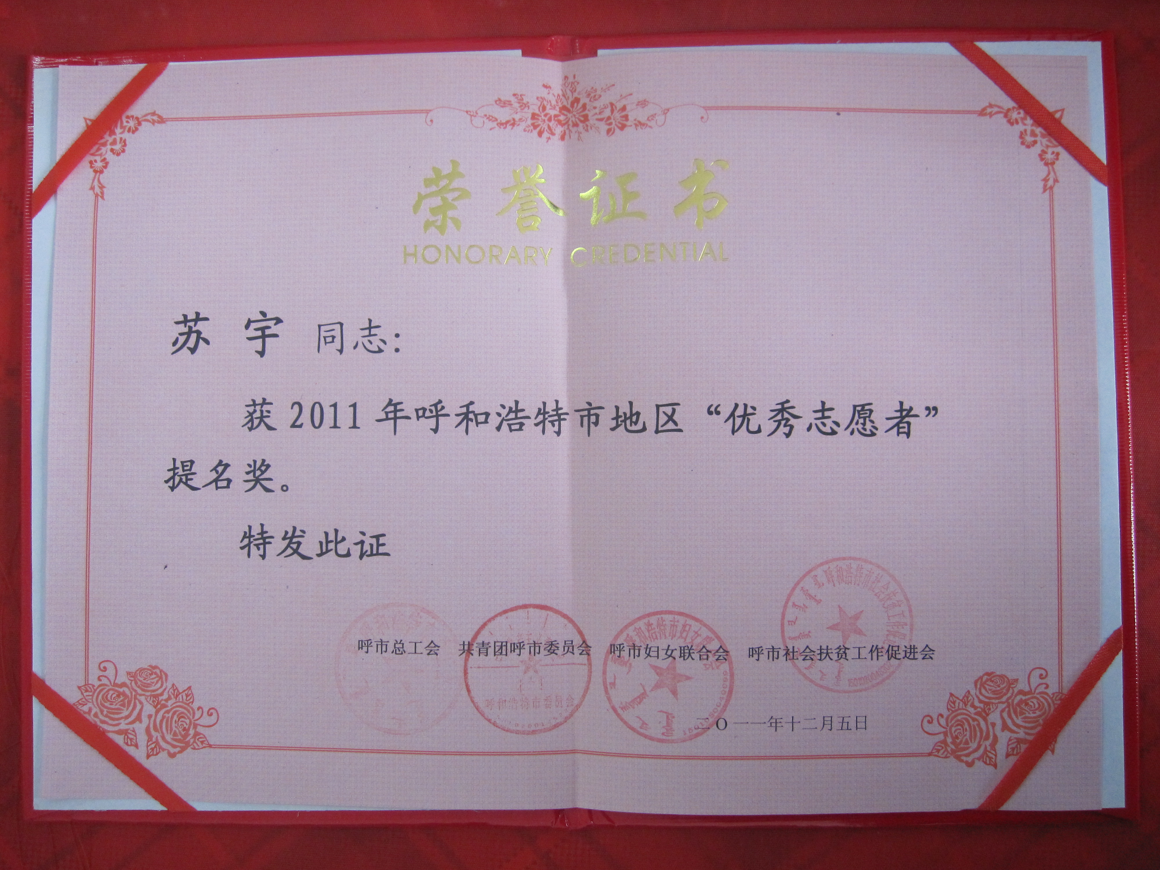 呼和浩特职业学院教师苏宇获得2011年呼和浩特地区“优秀志愿者”提名奖。