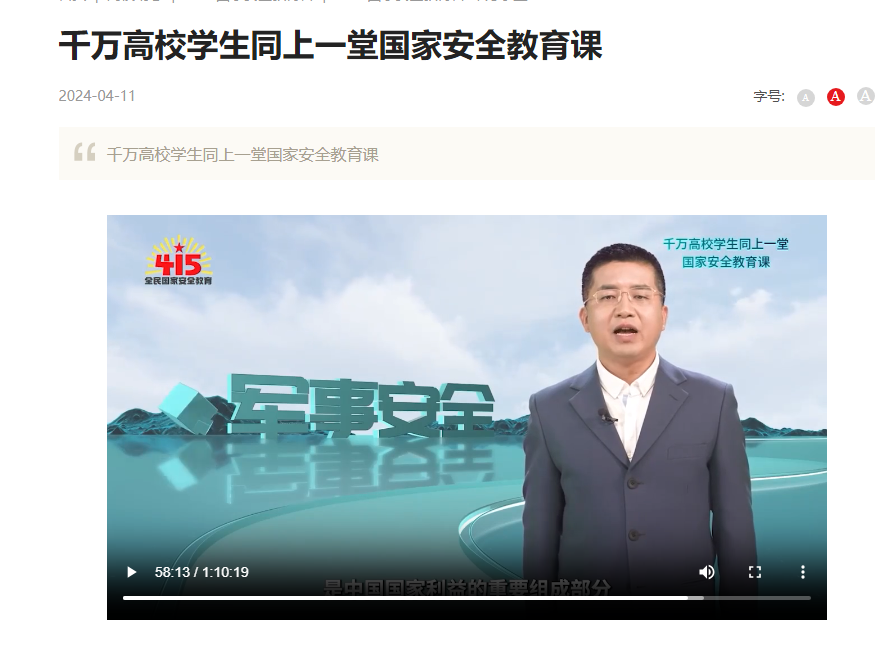 2024年是习近平总书记提出总体国家安全观10周年,今年4月15日是第九个全民国家安全教育日,为深入贯彻习近平总书记关于国家安全的重要指示精神,进一步推动总体国家安全观深入人心、落地生根,营造维护国家安全人人有责的浓厚氛围,围绕“总体国家安全观·创新引领10周年”活动主题,4月14日下午,团委党支部全体党员自行观看学习了《千万高校学生同上一堂国家安全教育课》。