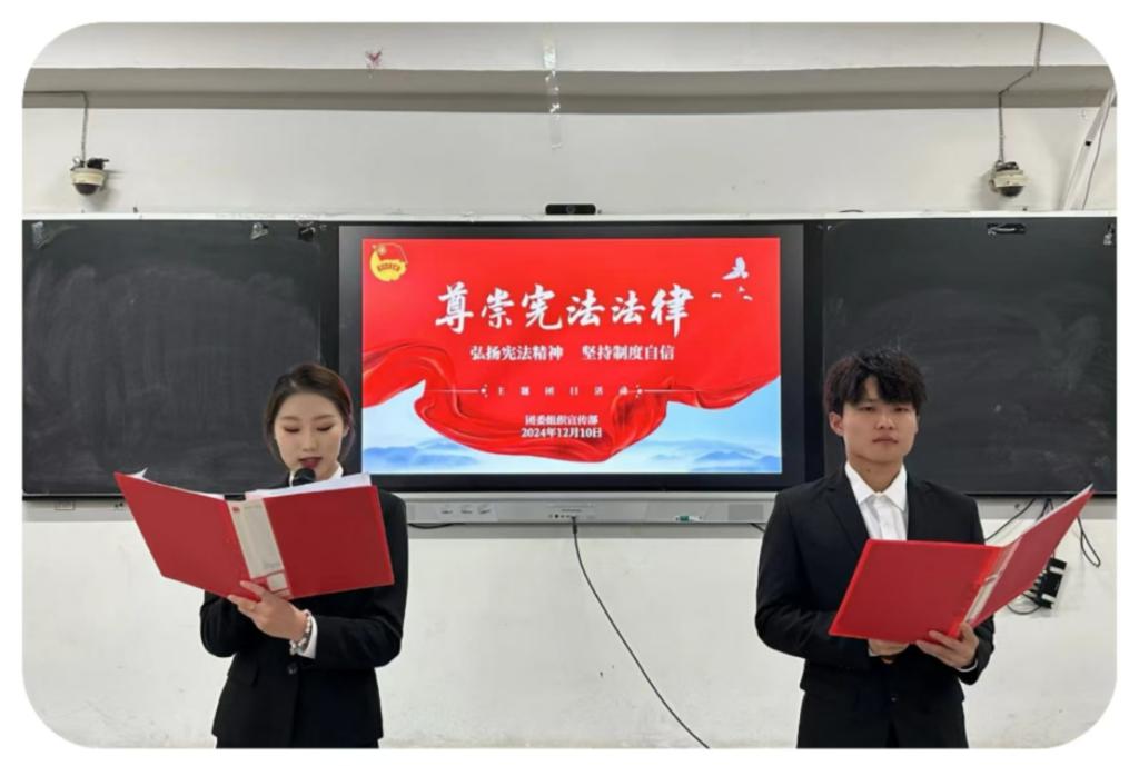 为深入学习和弘扬宪法精神,引导团员和青年自觉遵守宪法坚定捍卫宪法,培养法治意识,增强自我保护能力,12月10日晚,团委组织宣传部、社团管理部分别开展了“尊崇宪法法律——弘扬宪法精神,坚定制度自信”主题团日活动。