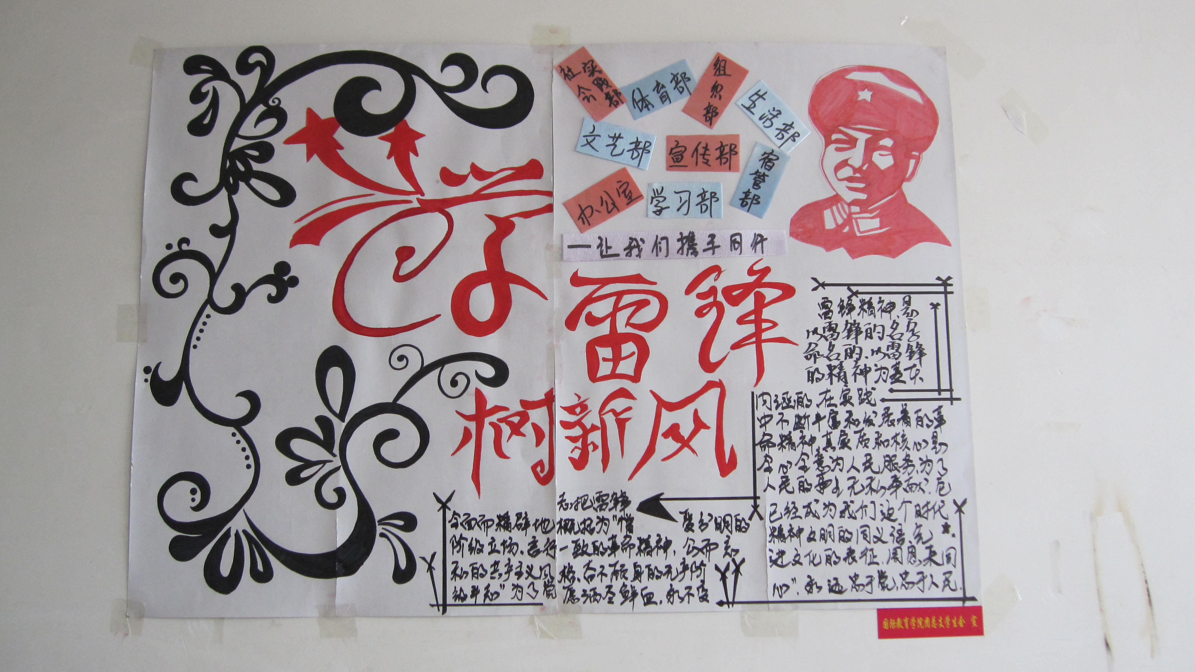 三月花开,春意渐浓,学雷锋日已经到来。2010年3月25日,国际教育学院团总支学生会宣传部举办了以“学雷锋,树新风”为主题的创意海报。这次海报旨在能够让同学们加强学习雷锋的精神。