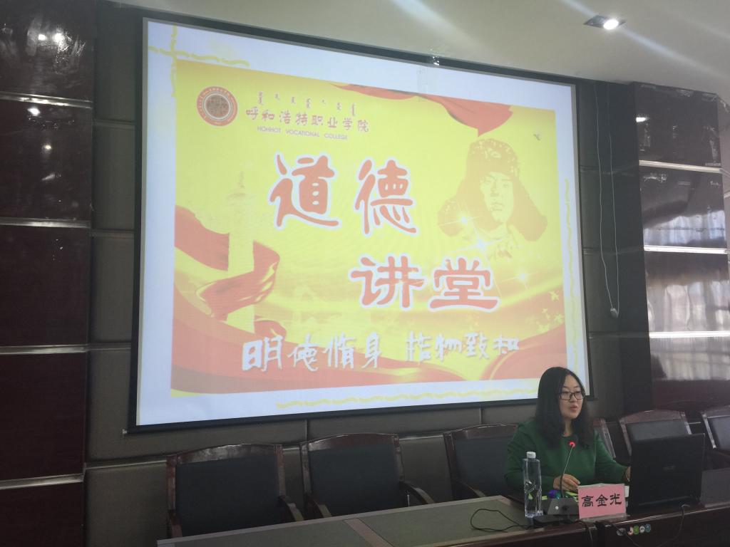 “道德讲堂”邀请了呼和浩特职业学院师范学院高金光老师为大家讲述自己的事迹。高老师在立足本职岗位、精心耕耘的同时,热心公益活动,不仅自己资助贫困学生,还积极联系全国爱心人士,一对一捐助了成绩优秀、家庭贫困的学生近百人。2015年3月,高金光老师被自治区党委宣传部授予“岗位学雷锋标兵”荣誉称号。同学们纷纷表示,要积举响应学院党委在全体师生中开展向高金光同志先进事迹学习的活动号召,学习高老师默默耕耘、潜心育人的崇高境界,学习高老师不求索取、奉献社会的博大胸襟,学习高老师锲而不舍、矢志不渝的坚守精神。