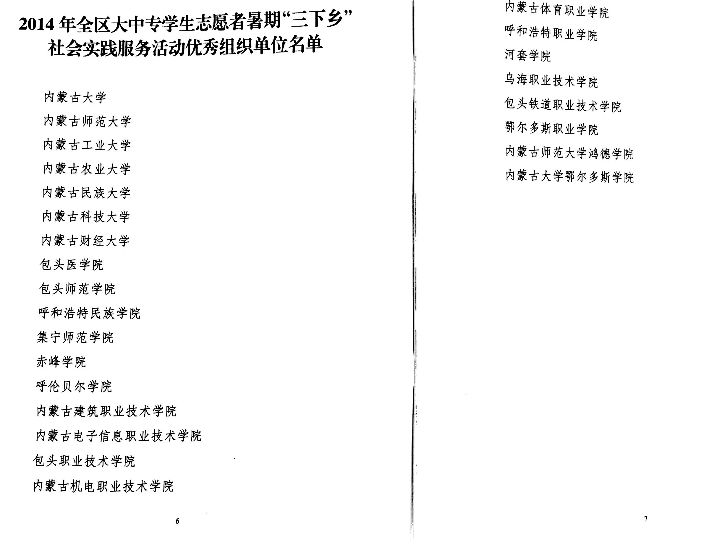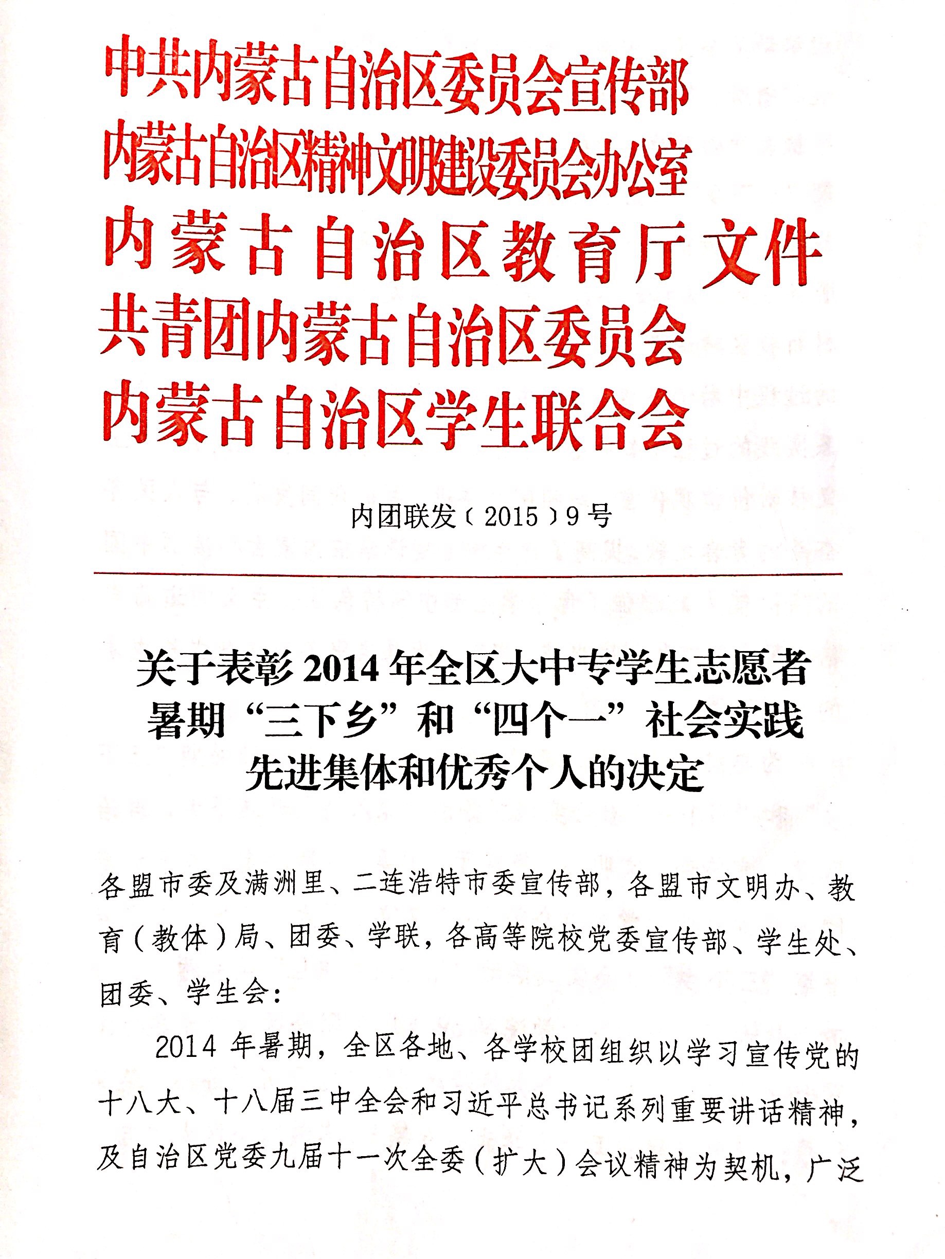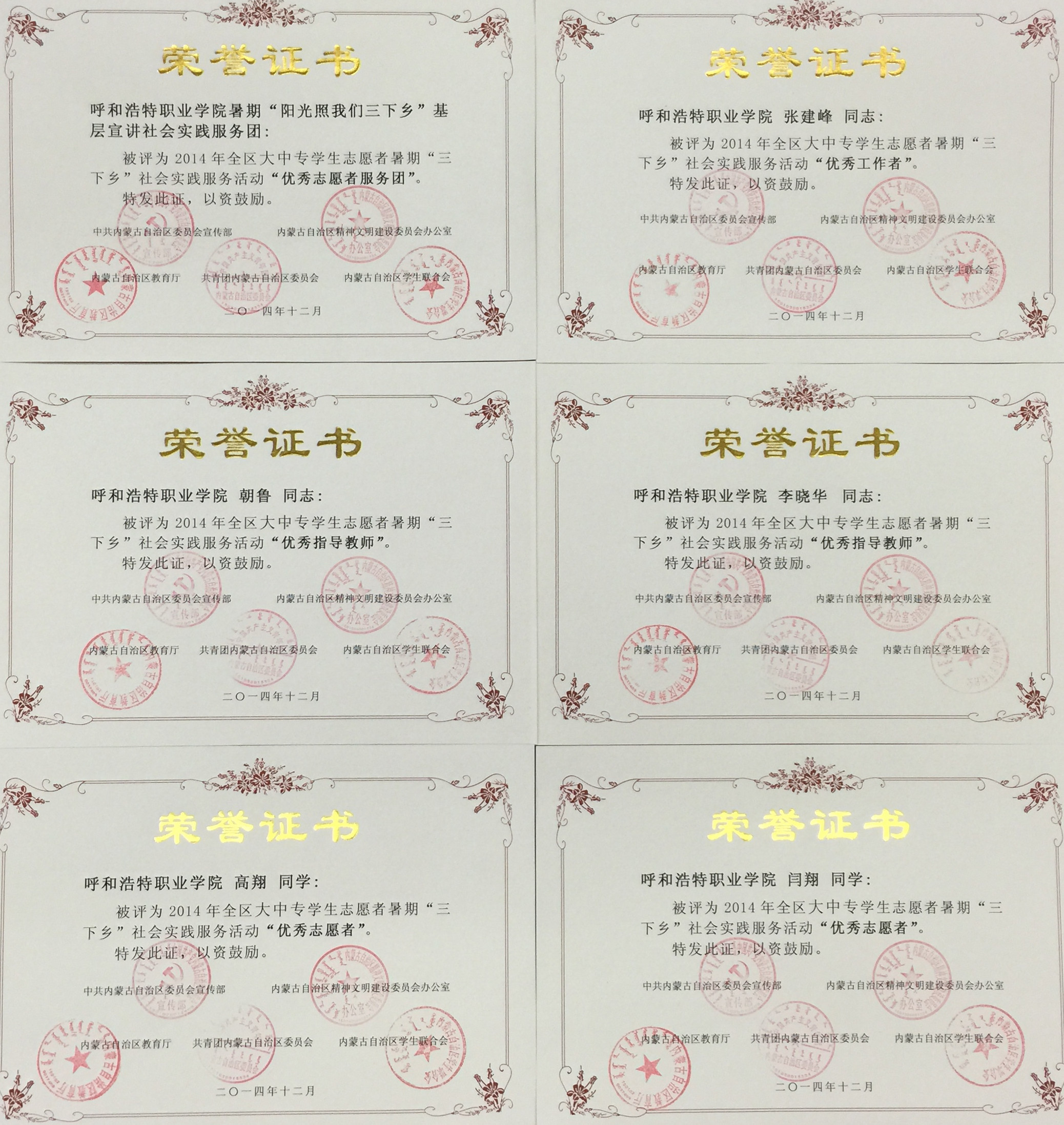 中共内蒙古自治区委员会宣传部、内蒙古自治区精神文明建设委员会办公室、内蒙古自治区教育厅、共青团内蒙古自治区委员会、内蒙古自治区学生联合会联合发文(内团联发〔2015〕9号)表彰了2014年全区大中专学生志愿者暑期“三下乡”和“四个一”社会实践先进集体和优秀个人。呼和浩特职业学院被评为“优秀组织单位”,呼和浩特职业学院建筑工程学院暑期阳光照我们“三下乡”基层宣讲社会实践服务团被评为“优秀志愿者服务团”,党政办公室秘书科科长朝鲁老师、建筑工程学院李晓华老师被评为“优秀指导教师”,机电工程学院团总支书记张建峰老师被评为“优秀工作者”,建筑工程学院高翔等8名同学被评为“优秀志愿者”。