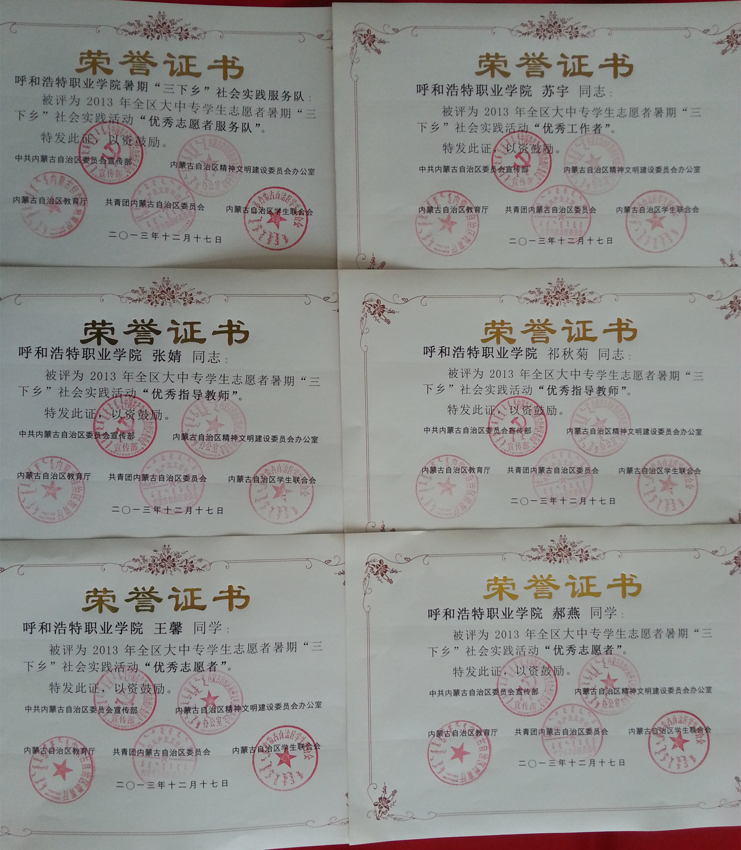 近日,中共内蒙古自治区委员会宣传部、内蒙古自治区精神文明建设委员会办公室、内蒙古自治区教育厅、共青团内蒙古自治区委员会、内蒙古自治区学生联合会联合发文表彰2013年全区大中专学生志愿者暑期“三下乡”和“四个一”社会实践活动先进集体和优秀个人。呼和浩特职业学院被评为“优秀组织单位”,呼和浩特职业学院暑期“三下乡”社会实践服务队被评为“优秀志愿者服务队”, 团委办公室主任张婧、计算机信息学院团总支书记祁秋菊被评为“优秀指导教师”,团委苏宇老师被评为“优秀工作者”,师范学院王馨等8名同学被评为“优秀志愿者”。