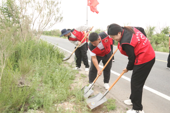 随后,实践团携手宝音志愿者服务协会,化身“环保志愿红”,奔赴公益林开展志愿服务活动。烈日下,同学们手持铁锹、水桶,分工协作,清理林间垃圾,为树苗浇水、培土,用实际行动守护北疆绿色生态屏障。在劳作间隙,实践团成员通过发放宣传手册、现场讲解等方式,开展推普和反诈宣传。他们用通俗易懂的语言,结合典型案例,向周边群众普及普通话的重要性和防诈骗知识,引导群众提升语言文化素养和反诈意识。“这样的活动很有意义,既美化了环境,又学到了实用知识!”一位参与活动的牧民竖起大拇指称赞。