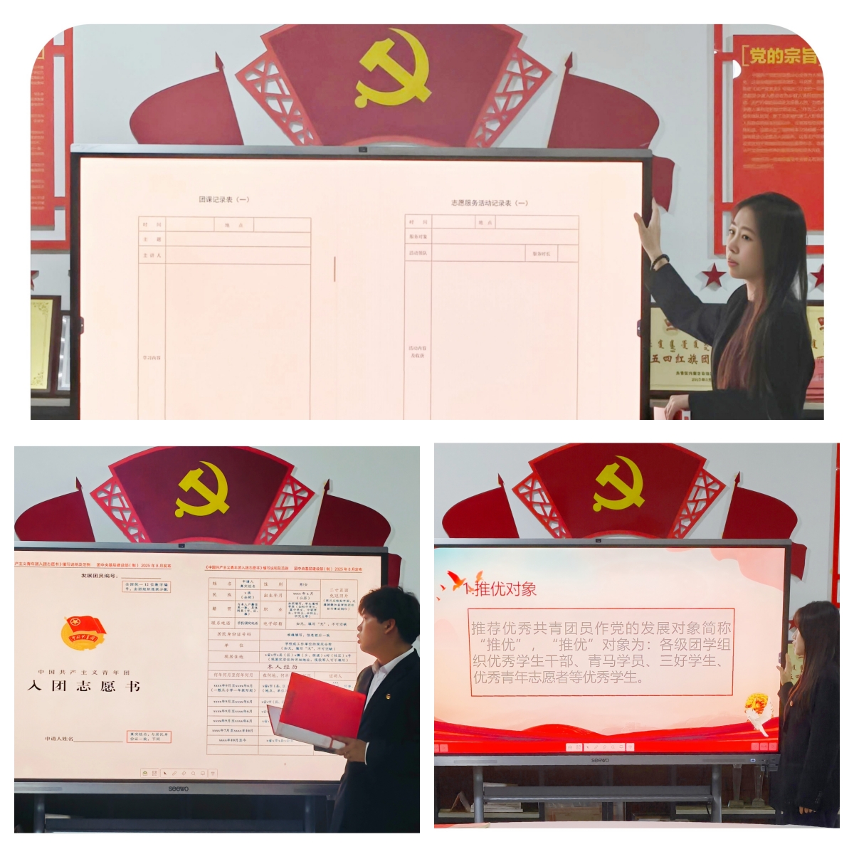 培训会上,内容聚焦共青团基层组织建设核心工作,突出实用性与规范性。学生团干部任静冉、边屹隆同学按照《关于做好2025年下半年发展团员工作的通知》要求,重点讲解了《团前教育手册》《入团志愿书》为核心内容,对团课学习内容、支部大会召开流程、规范填写要求及注意事项进行了梳理,确保发展团员流程规范、档案完整。随后,学生干部高娜娜带领同学们围绕《呼和浩特职业技术大学共青团员推优入党工作制度》进行了专题学习,从推优入党的政治标准、基本条件、推优流程等步骤进行了讲解。
