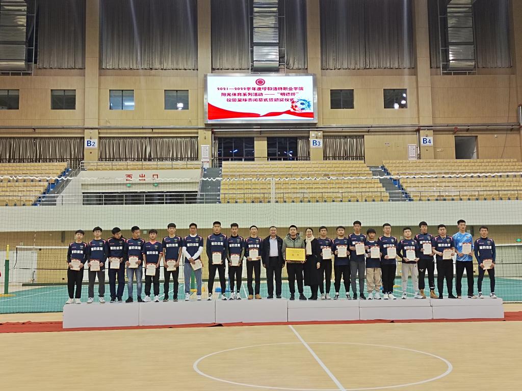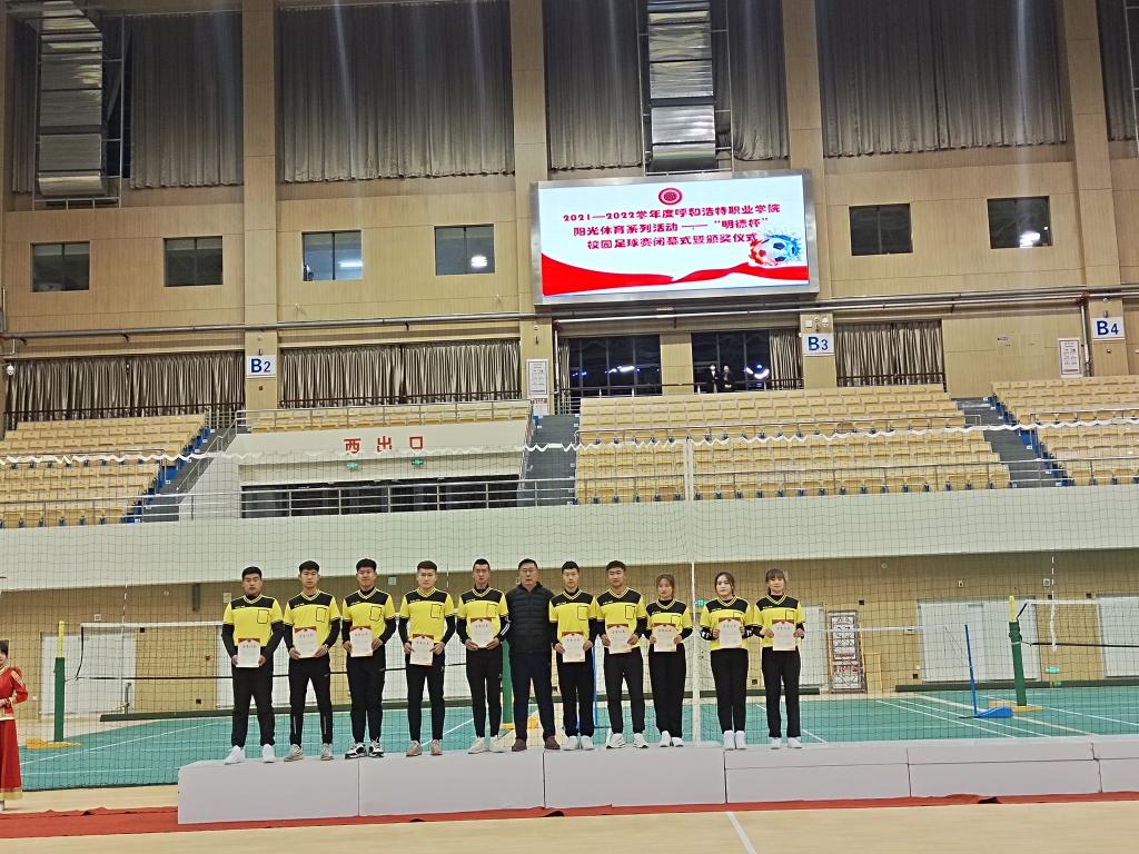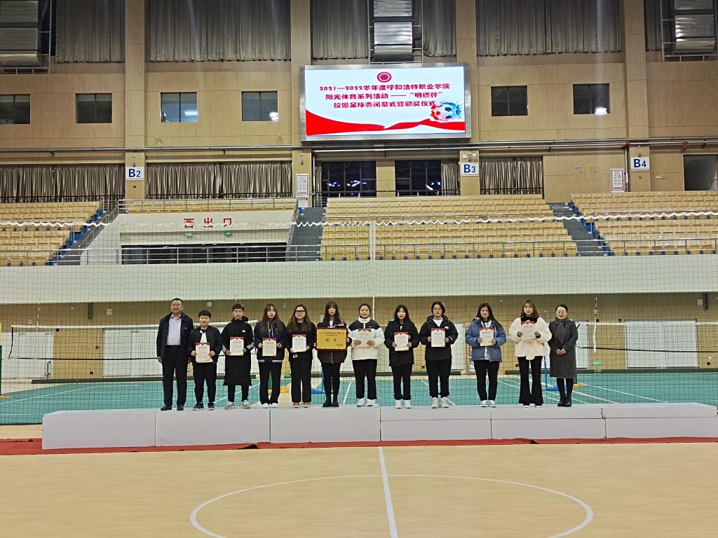 11月10日19:00,2021-2022学年度呼和浩特职业学院阳光体育系列活动—“明德杯”校园足球赛闭幕式暨颁奖仪式在体育馆举行。莅临本次闭幕式的领导有学院党委委员、党政办公室主任张瑞斌,团委书记张婧,学生工作处副处长朱海旺及各系部参赛队分管领导、领队、教练员。